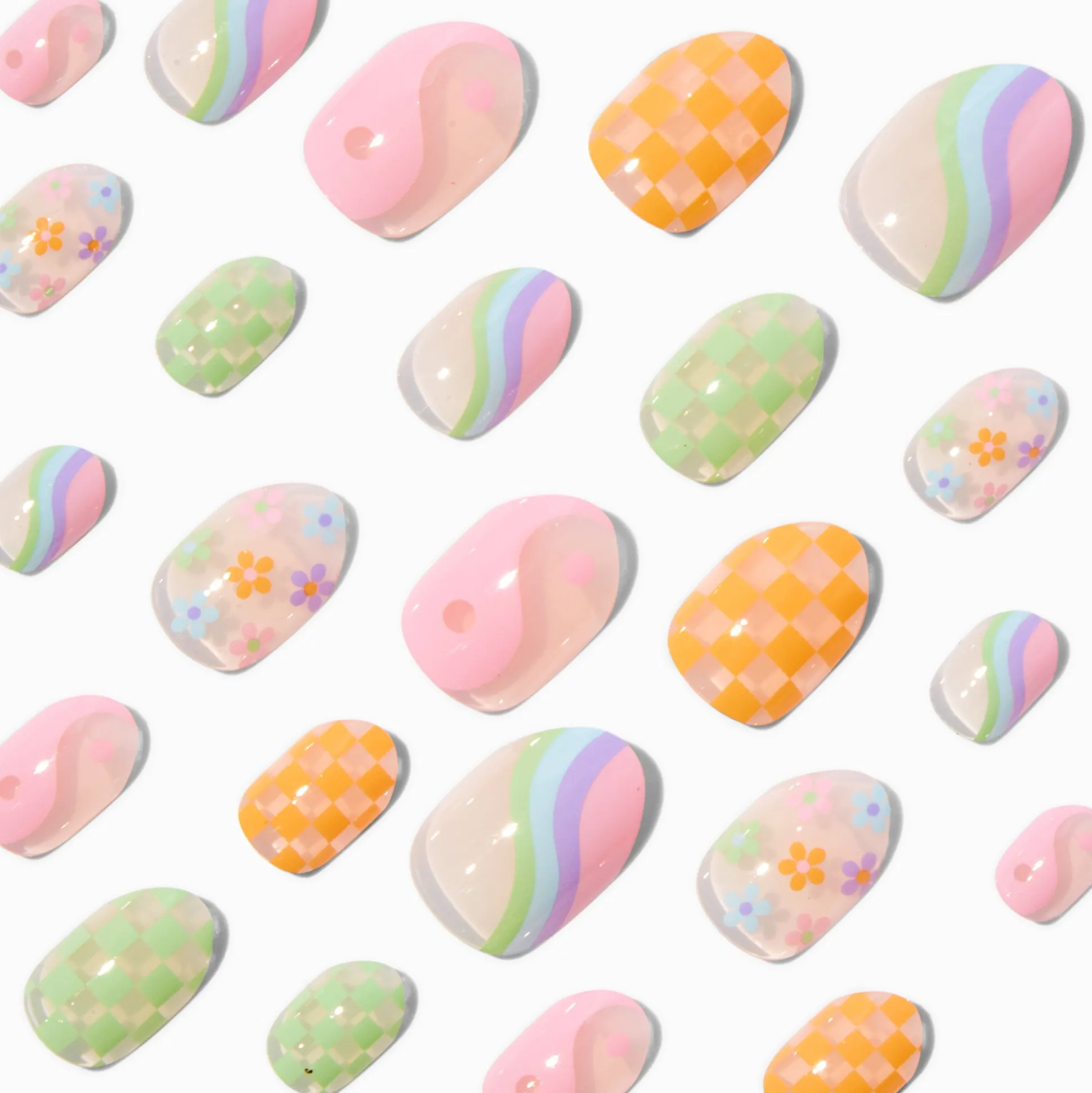 Feel oh so iconic with this on-trend set of faux nails. Stiletto-shaped nail set features Y2K-inspired patterns. Nails are easy to apply, just press on and go!