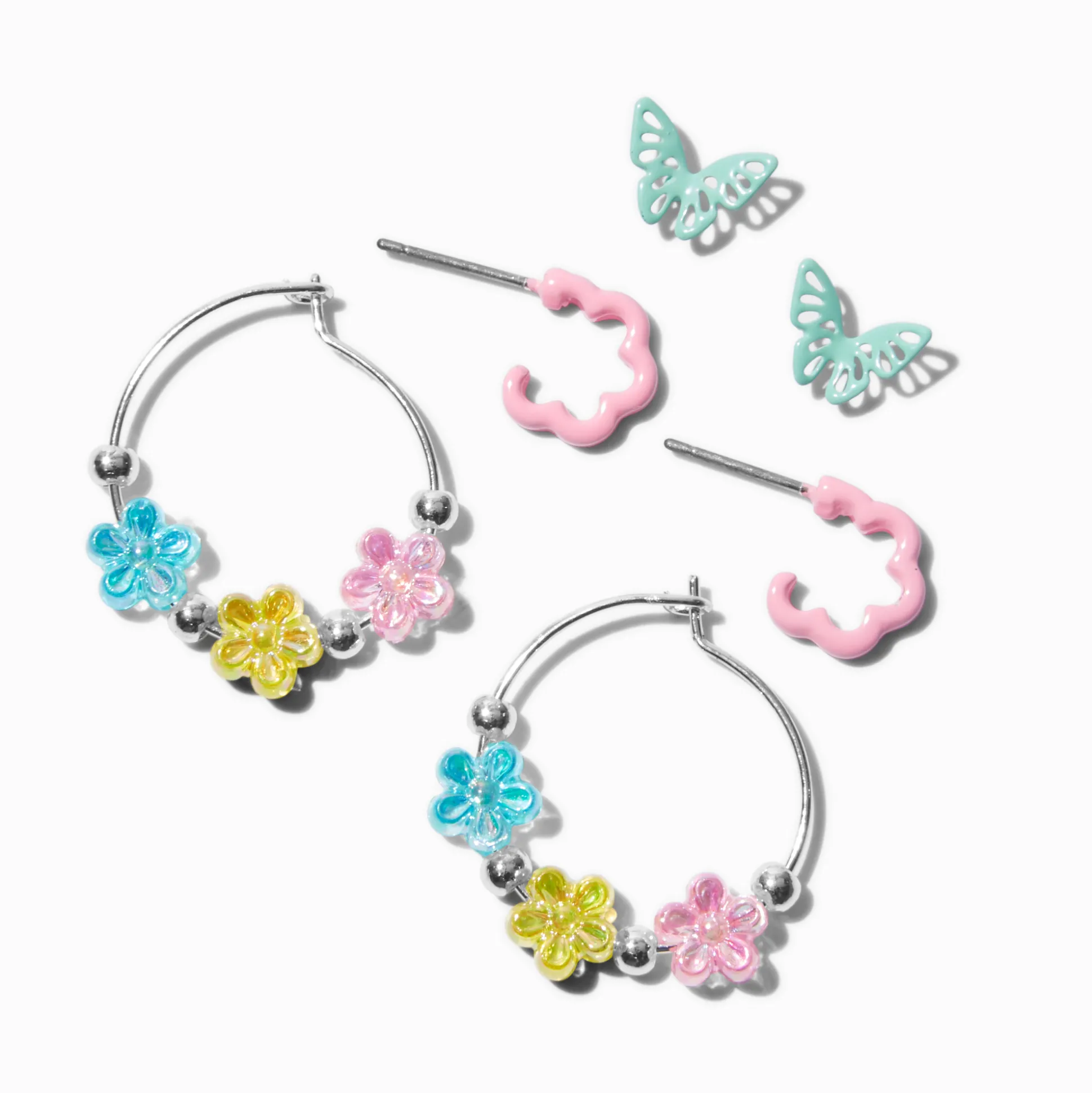 Always have the perfect pairs of earrings with this set. The 3 pack includes pastel Spring icons, such as: flowers and butterflies.