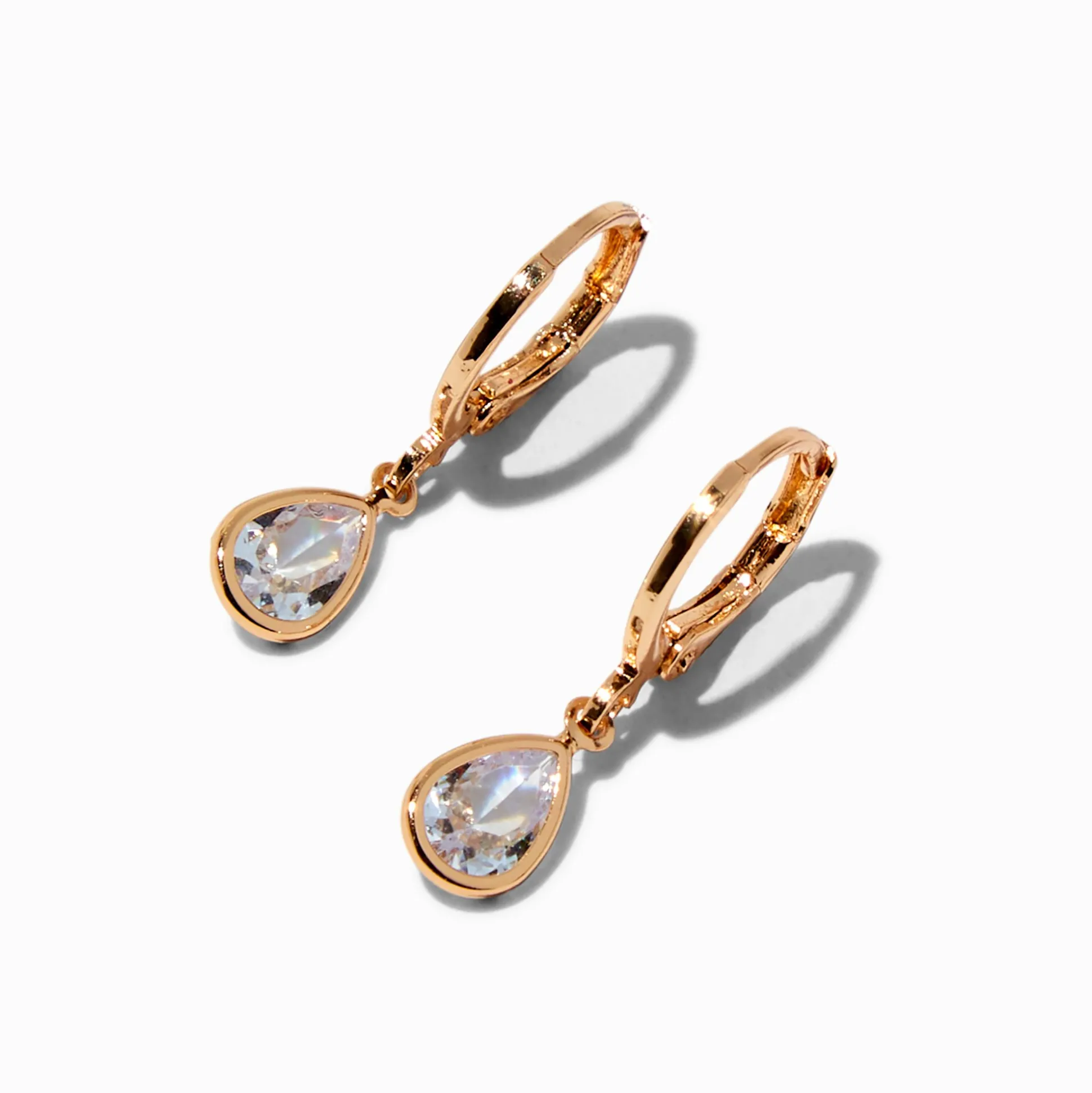 Cubic zirconias are gorgeous stones that sparkle in the light! These pear-shaped beauties hang from gold-tone huggie hoop earrings that match your other gold-tone accessories.