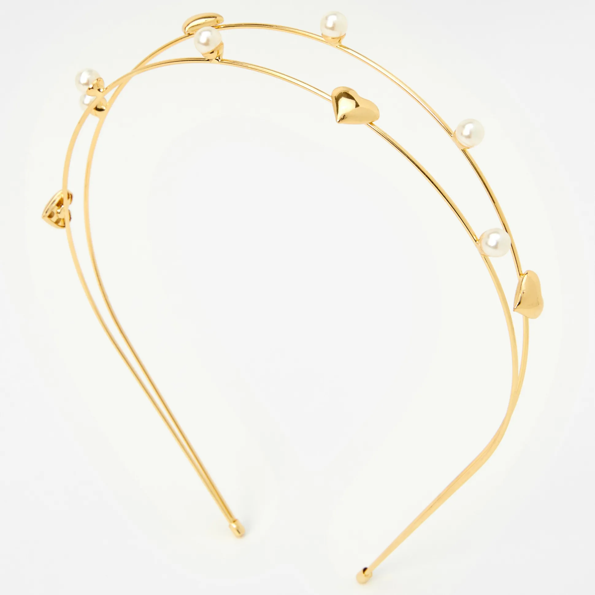 Give hairstyles lots of sparkle with this double row headband. The thin bands are accented with pearl and hearts to make hair look vibrant.