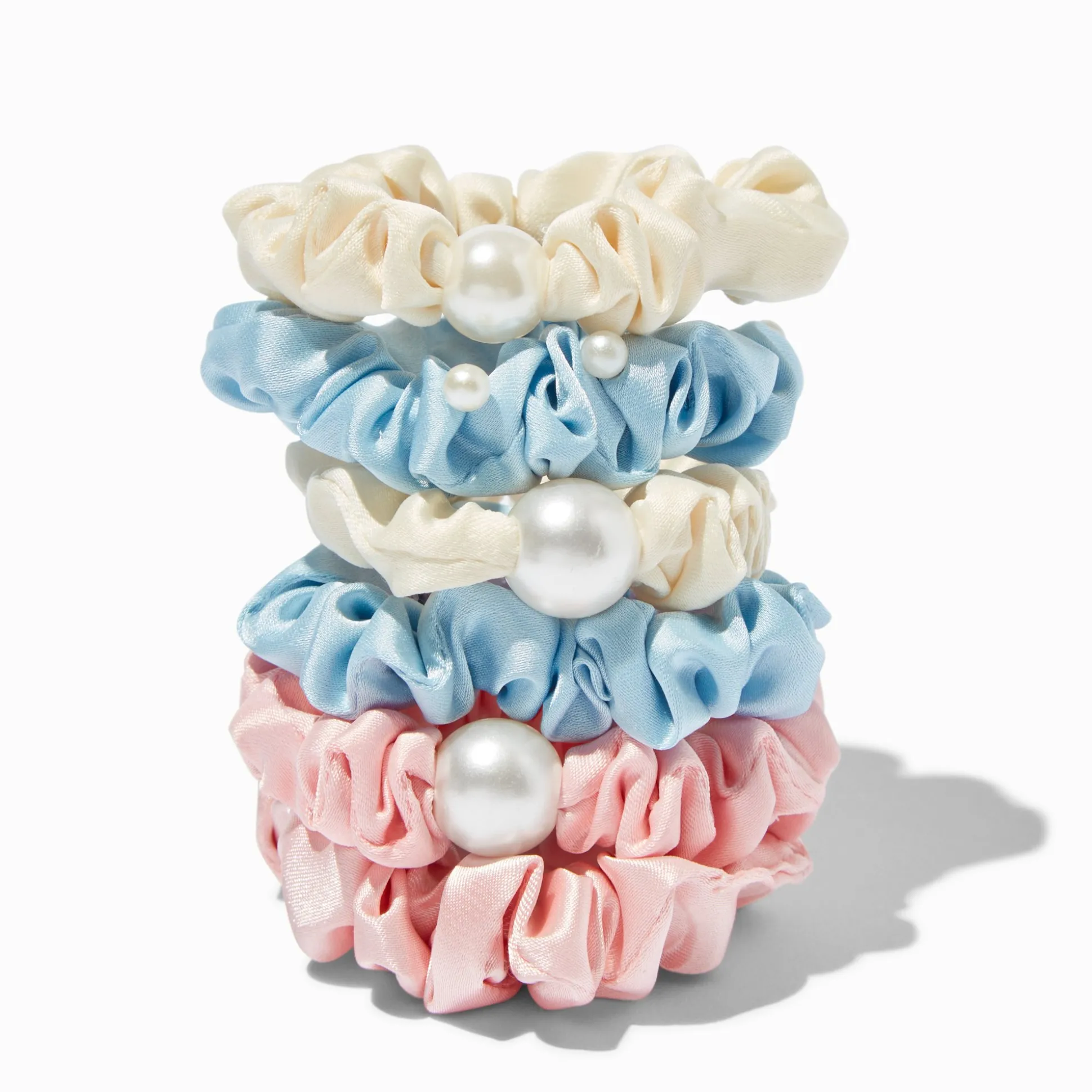 Pick the perfect scrunchie in this six-pack set. It includes six skinny silky scrunchies in a blue, pink, and ivory with faux pearl accents.