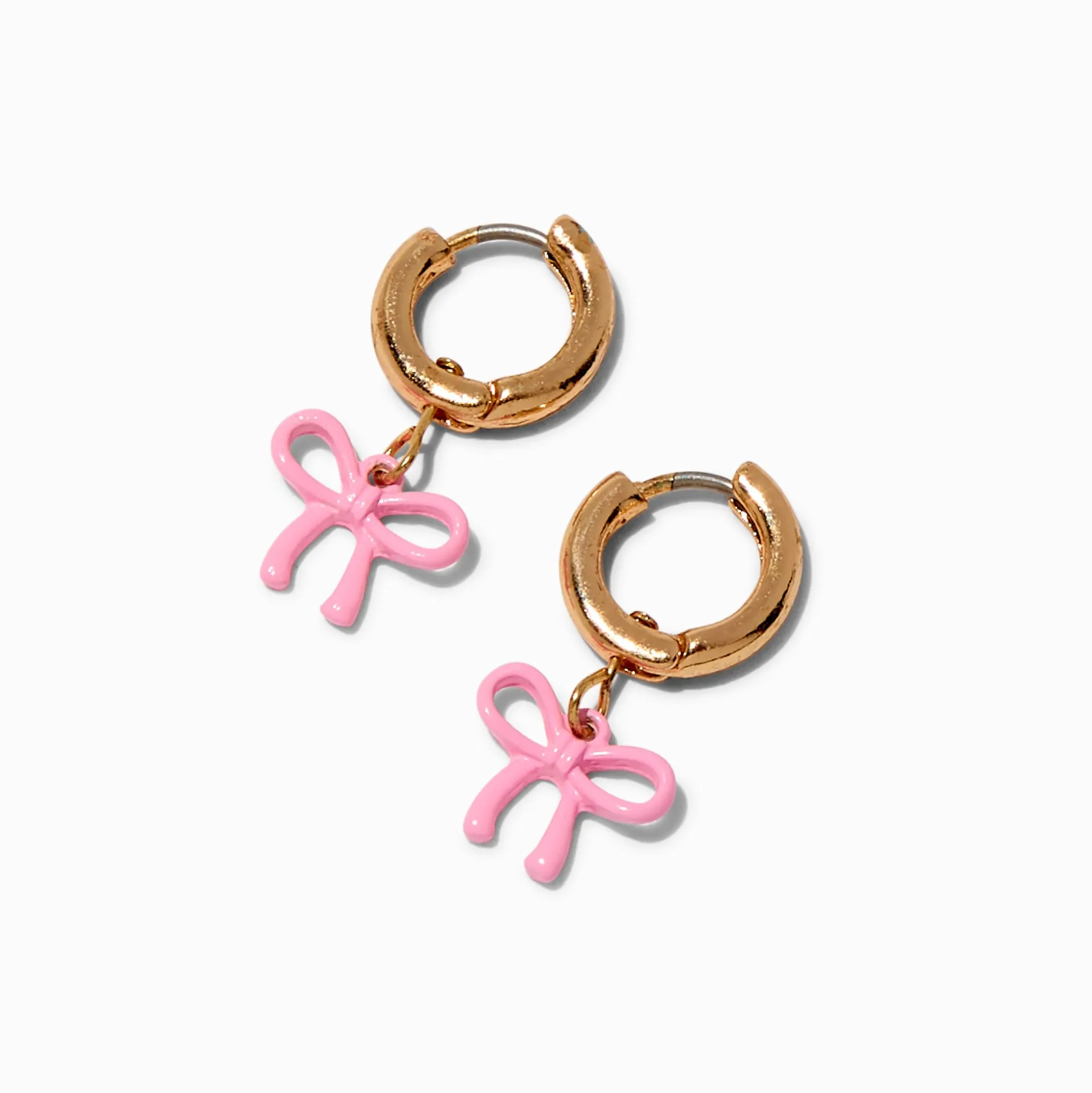 Finish your look with a delightful pink bow with these hoop earrings. The gold-tone designs will work with all of your fave ‘fits.