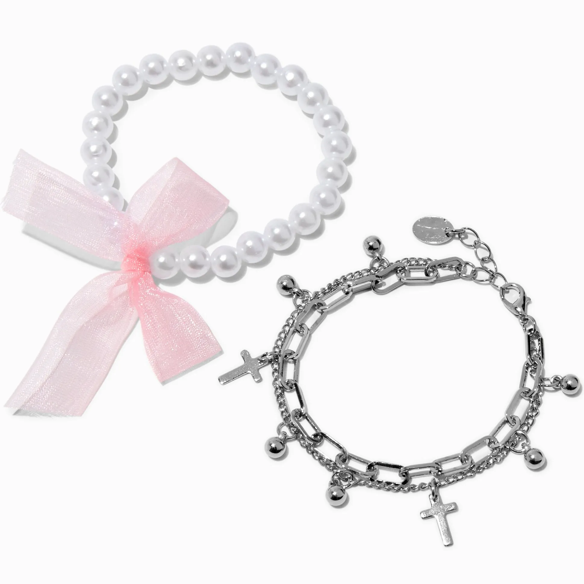 Edge meets coquette in this adorable bracelet set. This set includes a faux pearl stretch bracelet that has a chiffon bow, and a silver-tone multi-strand bracelet in a chain fashion with cross charms.