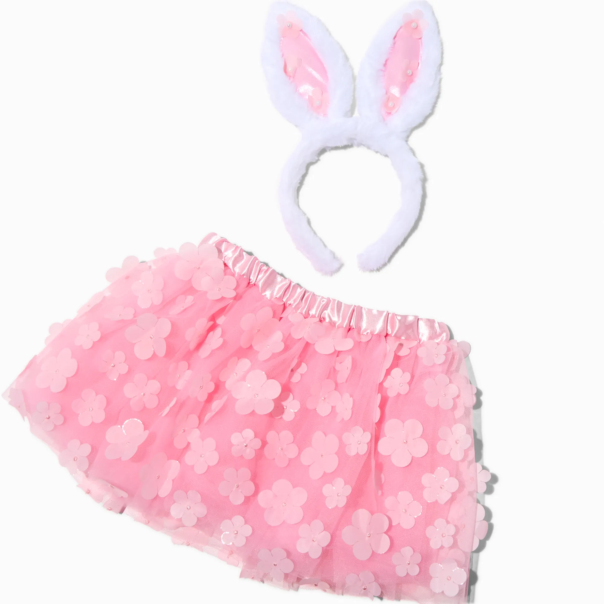 You’ll have so much fun hopping around in this adorable set, perfect for Easter parties and egg hunts, or for dress-up time, anytime! The plush white bunny ears and coordinating pink tutu are covered all over in flower-shaped details. The satin-like elastic waist stretches to fit.