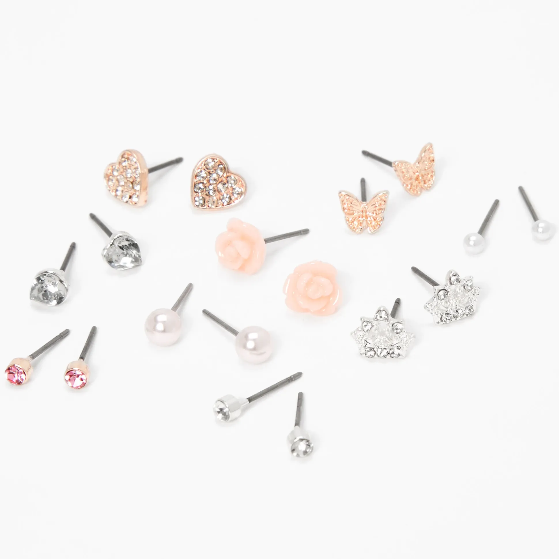 The perfect set of earrings for the girl who loves pink! This set of earrings includes 9 pairs of different studs, featuring butterflies, roses, hearts, faux crystals, and more.