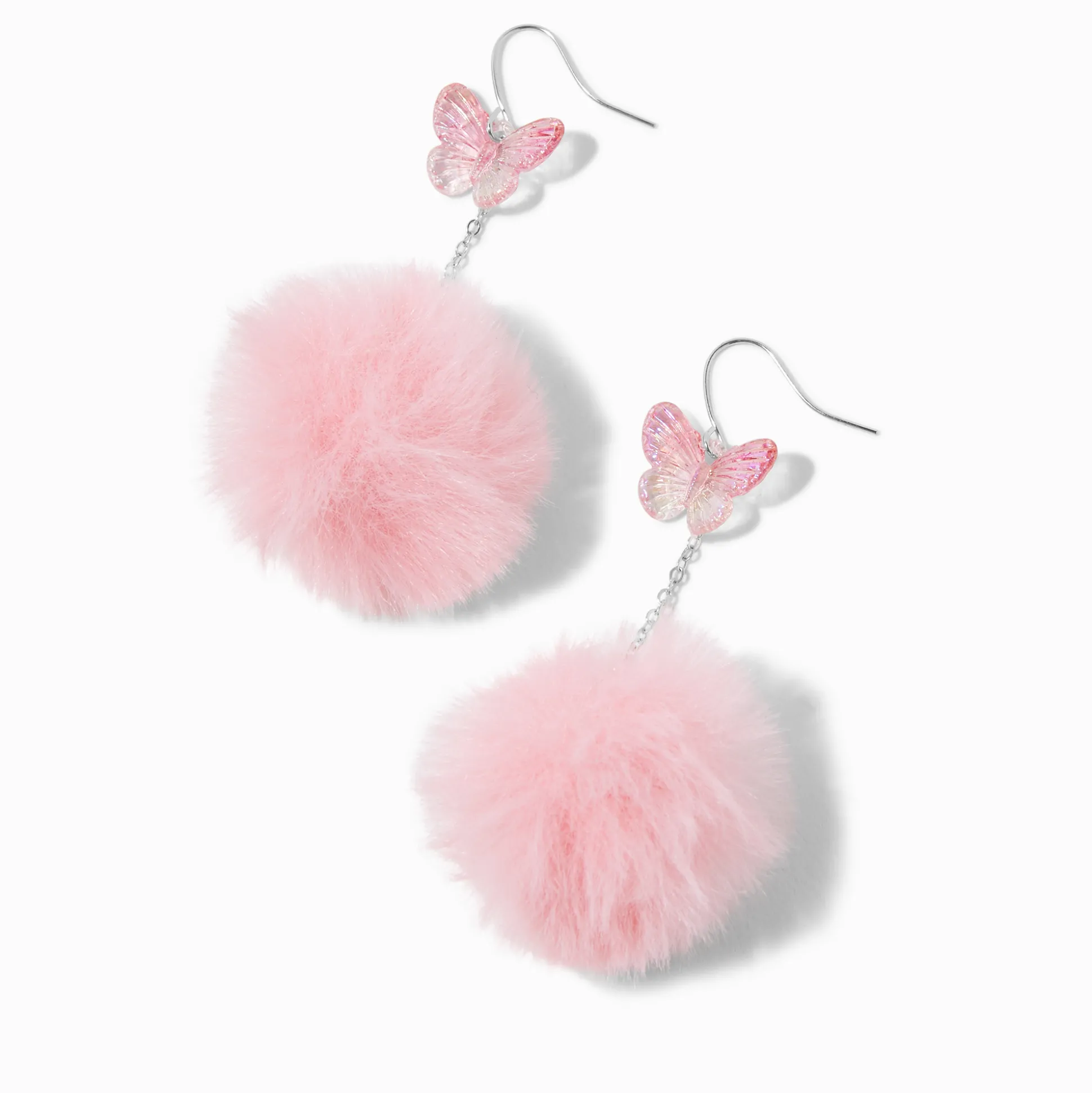 Add a pop of pretty pink to your look! These cute drop earrings feature a light pink pom pom ball & butterfly charm dangling from each earring.
