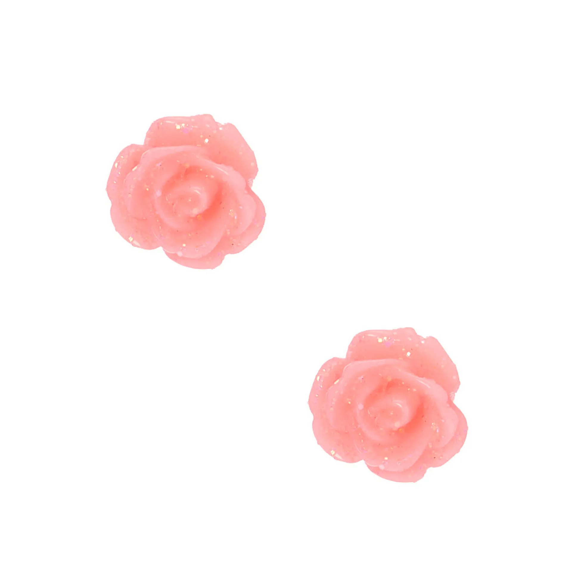 Give your look roses with these pretty pink rose polymer clay designs. Covered in a subtle sparkle, these earrings also have a sterling silver post for lasting wear.