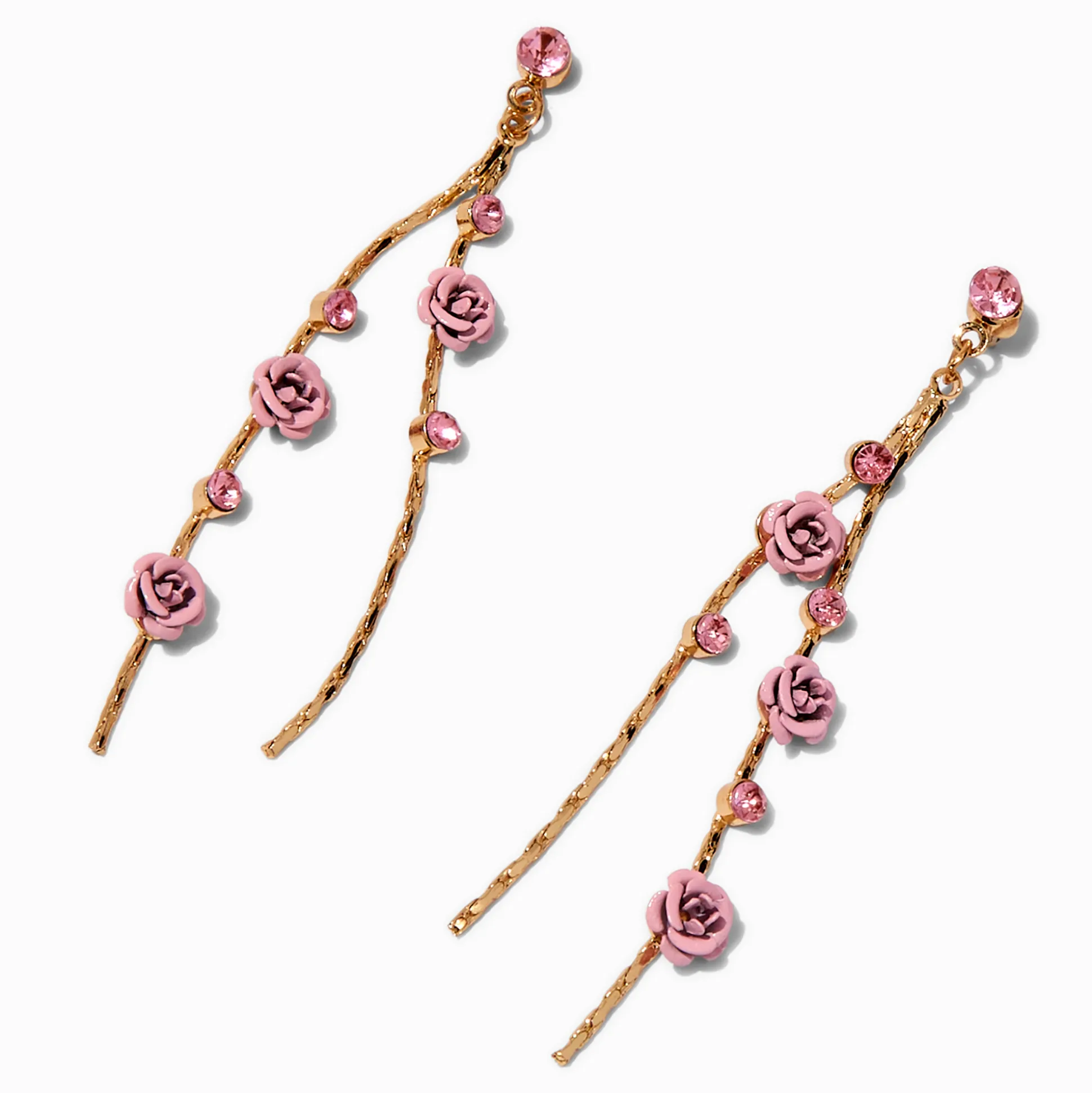 Give your look some flowers with these drop earrings. The gold-tone designs have strands like vines that are accented with carved roses and pink faux crystals.