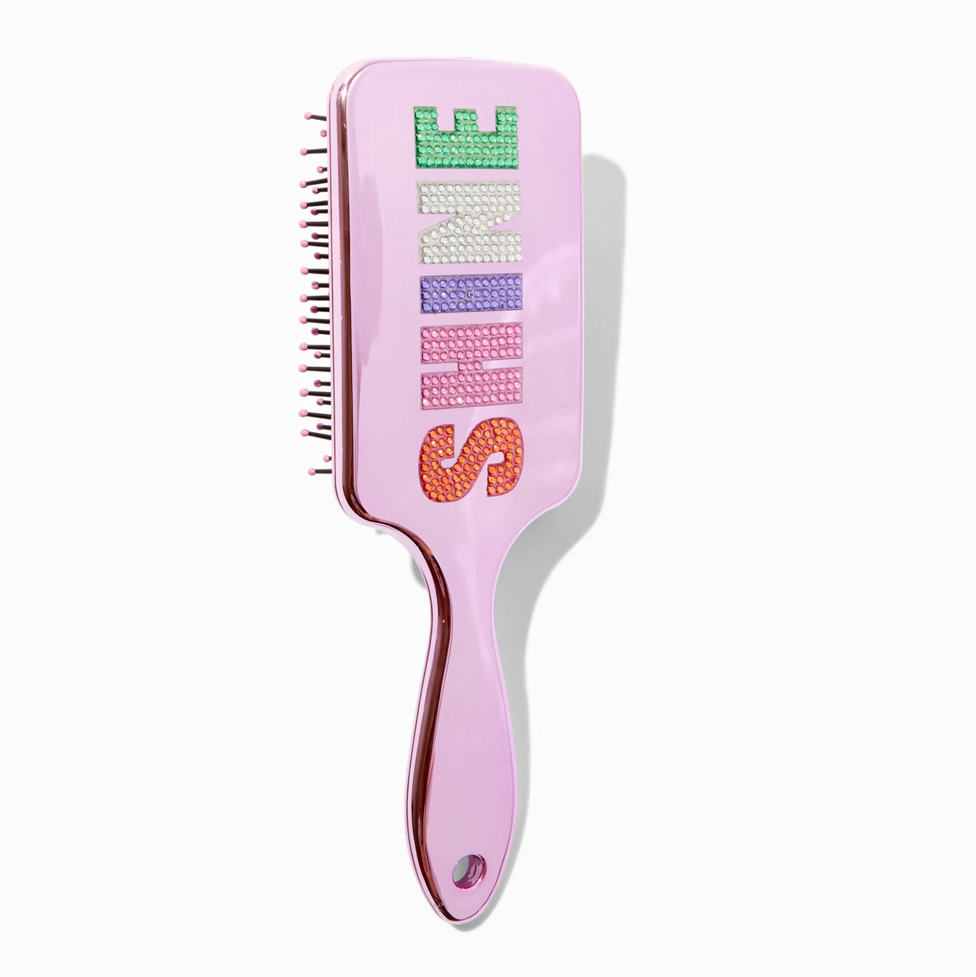 Maintaining your hair will be so much more fun with this chrome paddle hair brush. “Shine” in rainbow gems give charm to an everyday essential, for a look you will love.