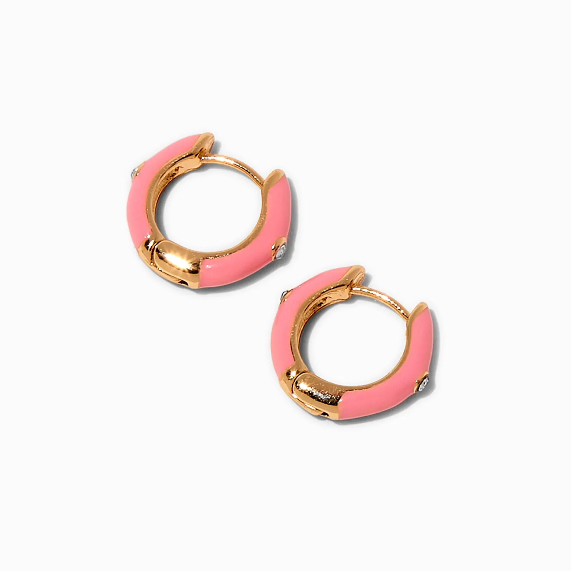 Give your ears some love with these enamel cuties! These huggie hoop earrings feature a pink color with a hinge snap closure that will hug your ears just right.