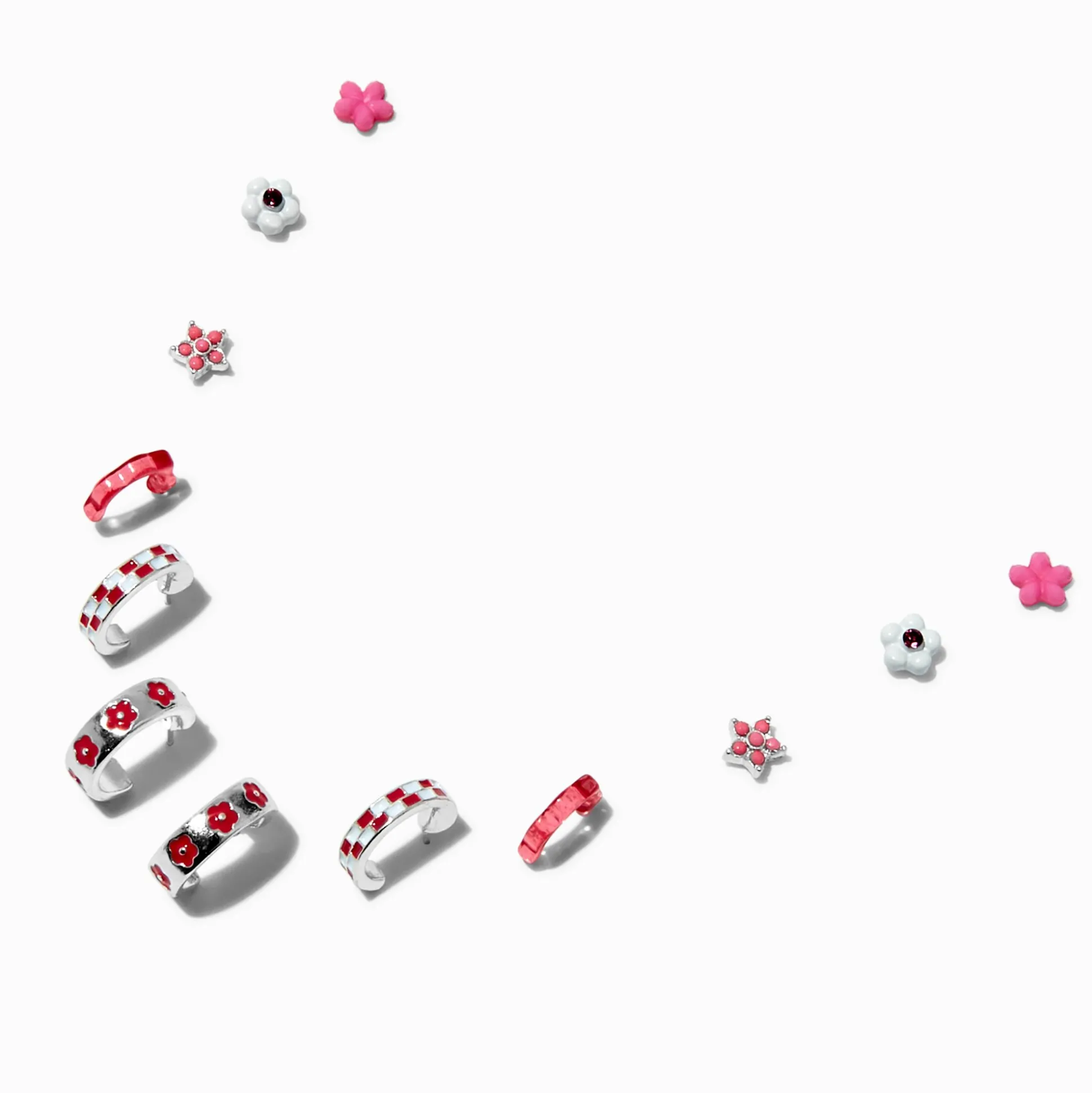 Mix or match these earrings to create a different look each day! The pink and white flowers and checkered designs coordinate perfectly with each other. You get all six pairs shown… three pairs of dainty hoops and three pairs of studs.