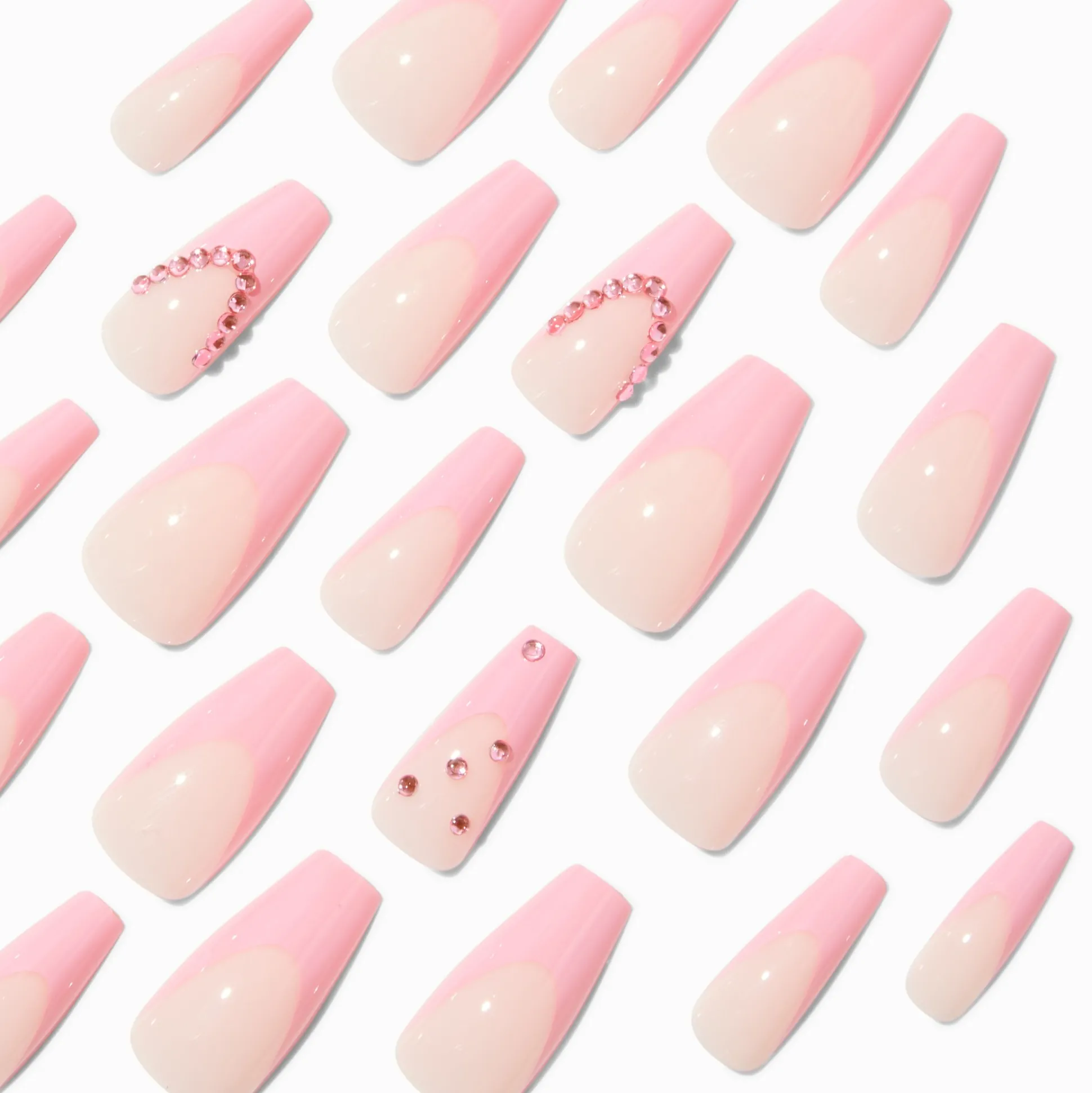 With an improved fit and up to a 7-day wear, these squareletto vegan faux nails are on-trend faves. They come in 12 different sizes, so finding the perfect shaped nail is a breeze. With a squareletto shape, these faux nails have a pink bling French tip finish.