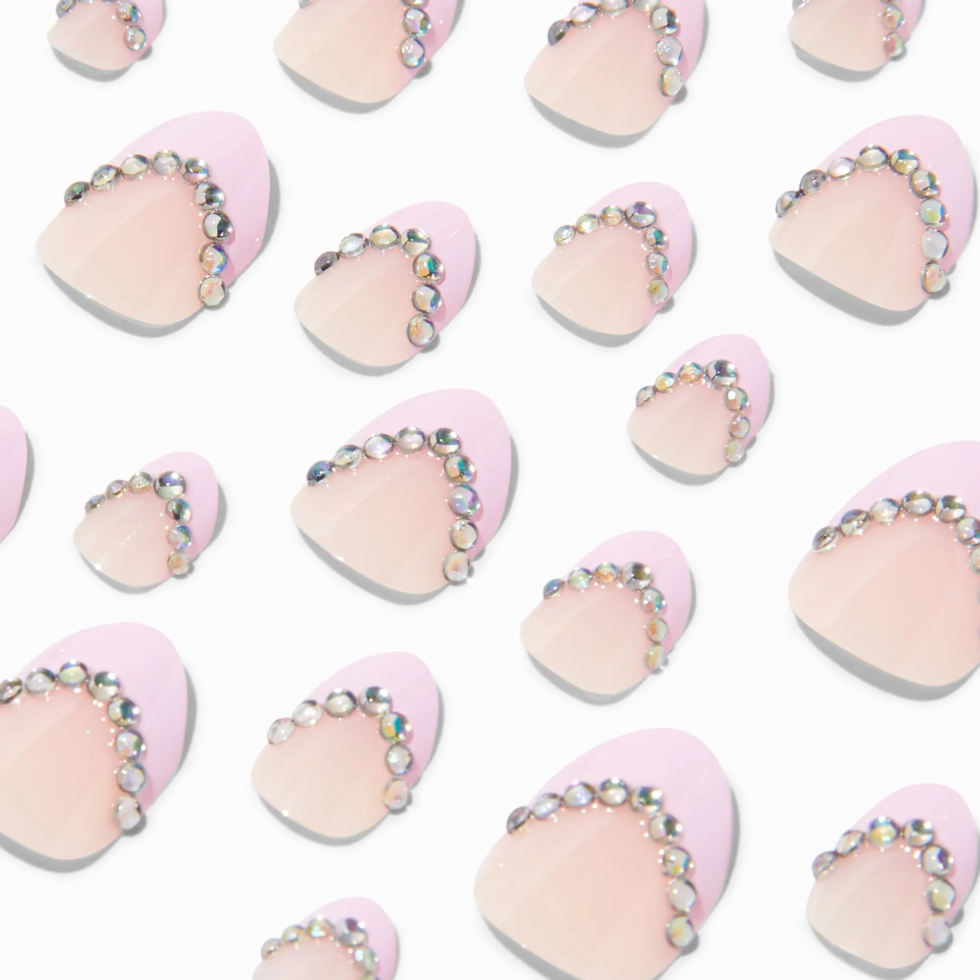 Serious glamour will be right at your fingertips with this on-trend set of faux nails. Stiletto-shaped nail set features a pink french toip & faux gem details. Vegan nails are easy to apply, just press on and go!