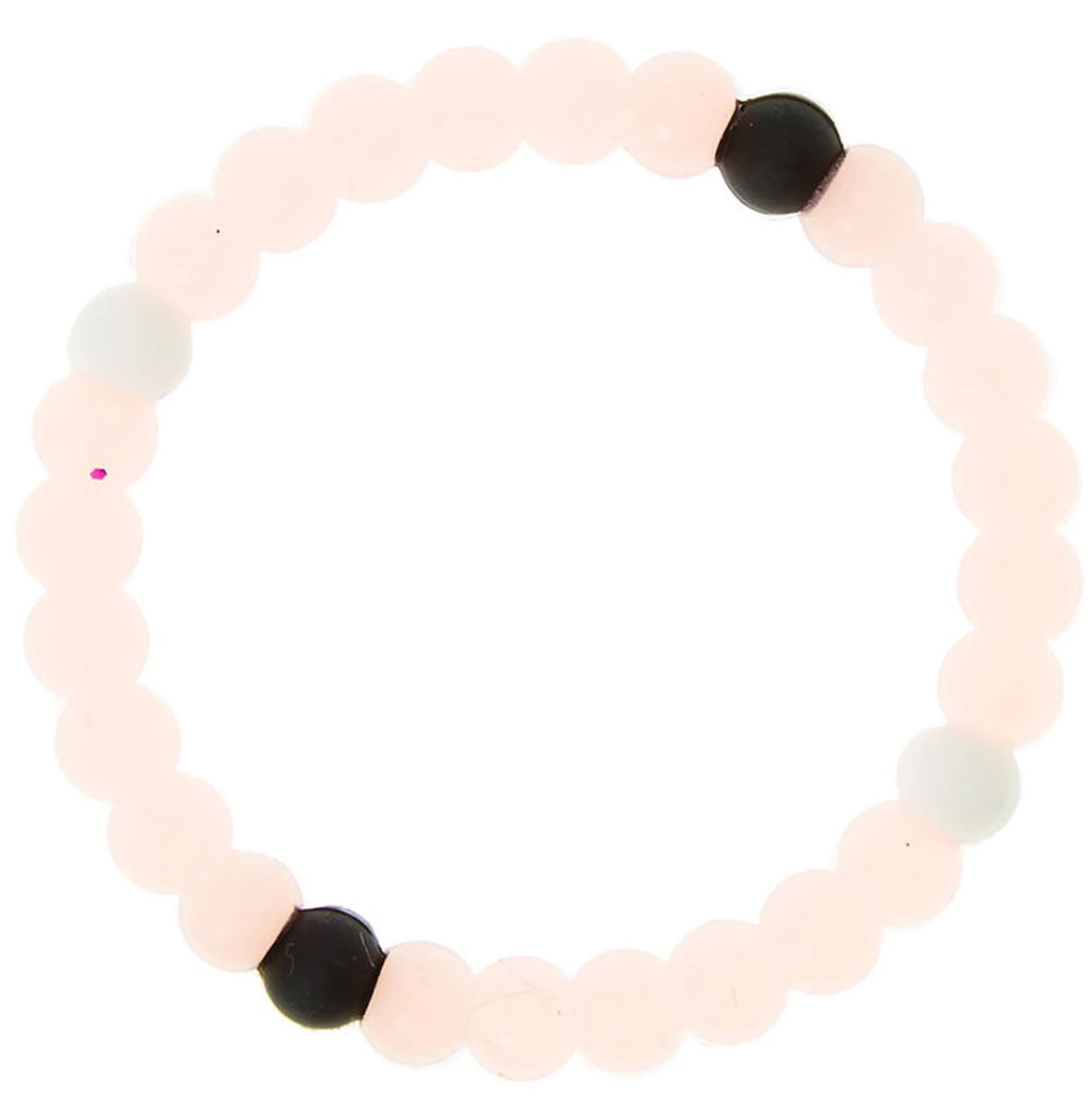 Add a good luck charm to your style with this love fortune bracelet. The light pink rubber beads glow in the dark and are accented with white and black beads for a look that will bring you chill vibes.