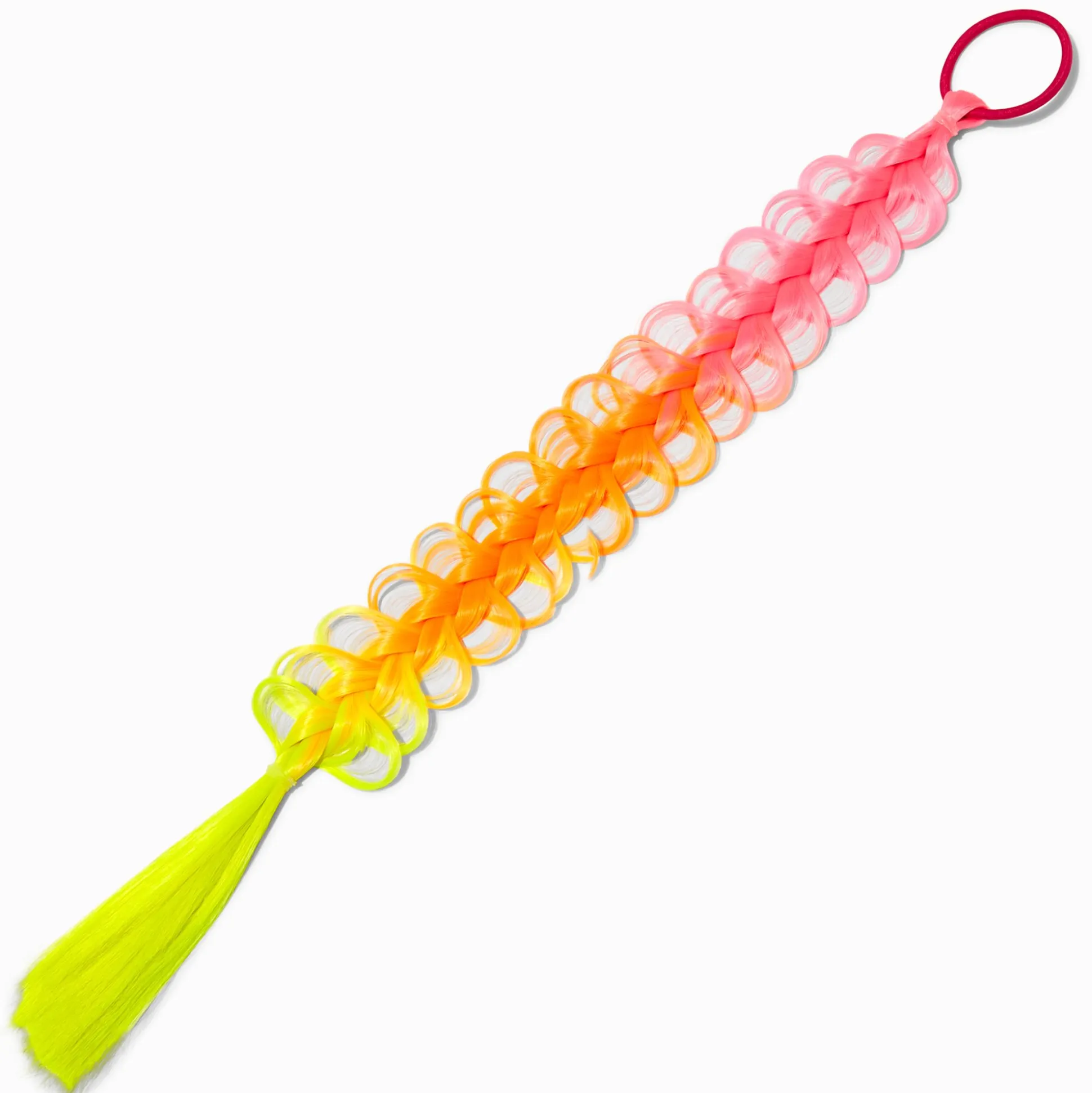 Turn up the volume with your hair style by adding this funky hair tie. The elastic hair tie has a multi-hued braid of fake hair.