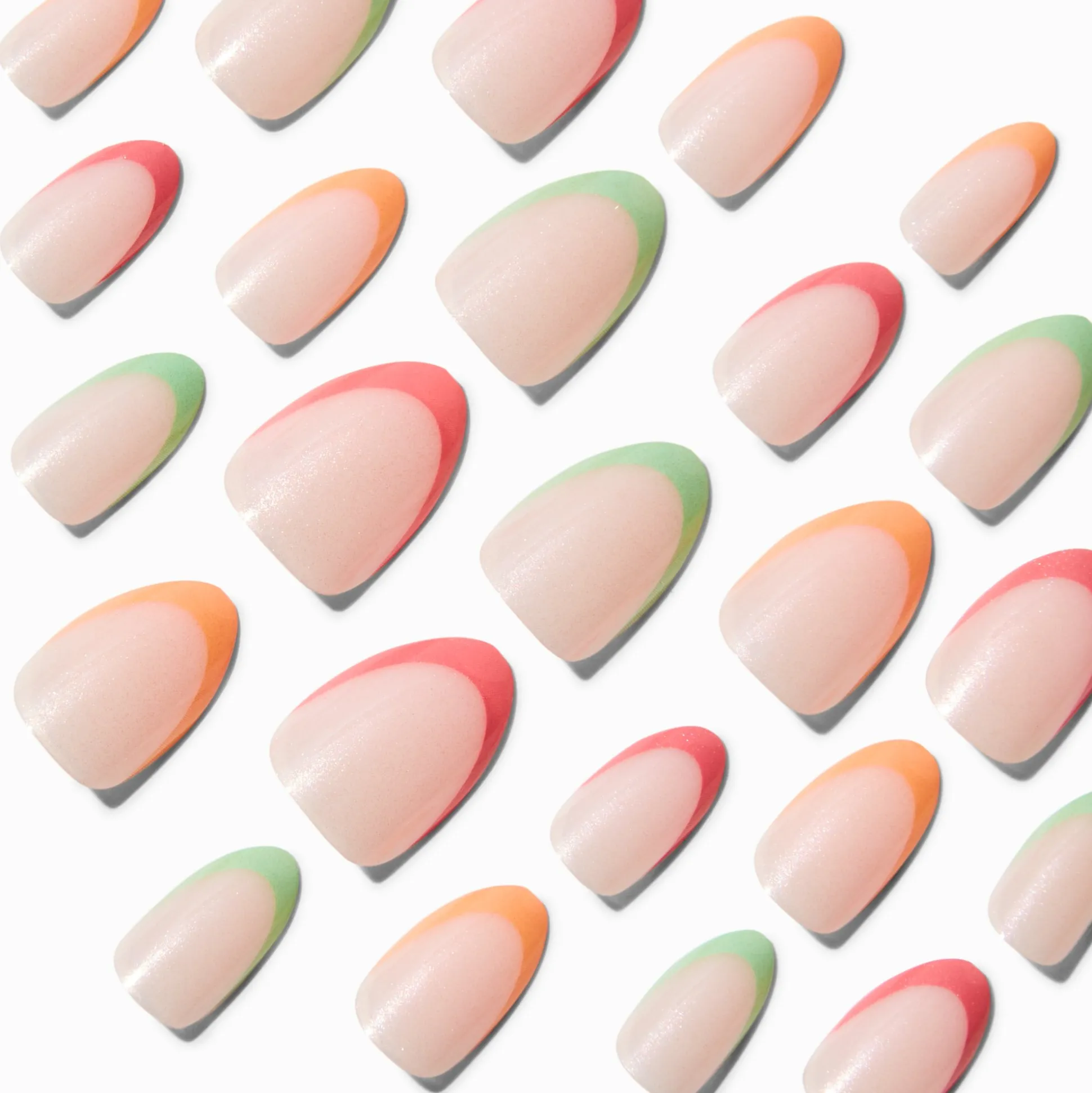 With an improved fit and up to a 7-day wear, these vegan faux nails are on-trend faves. They come in 12 different sizes, so finding the perfect shaped nail is a breeze. With a short almond shape, these faux nails have pink, orange, and green French tips.