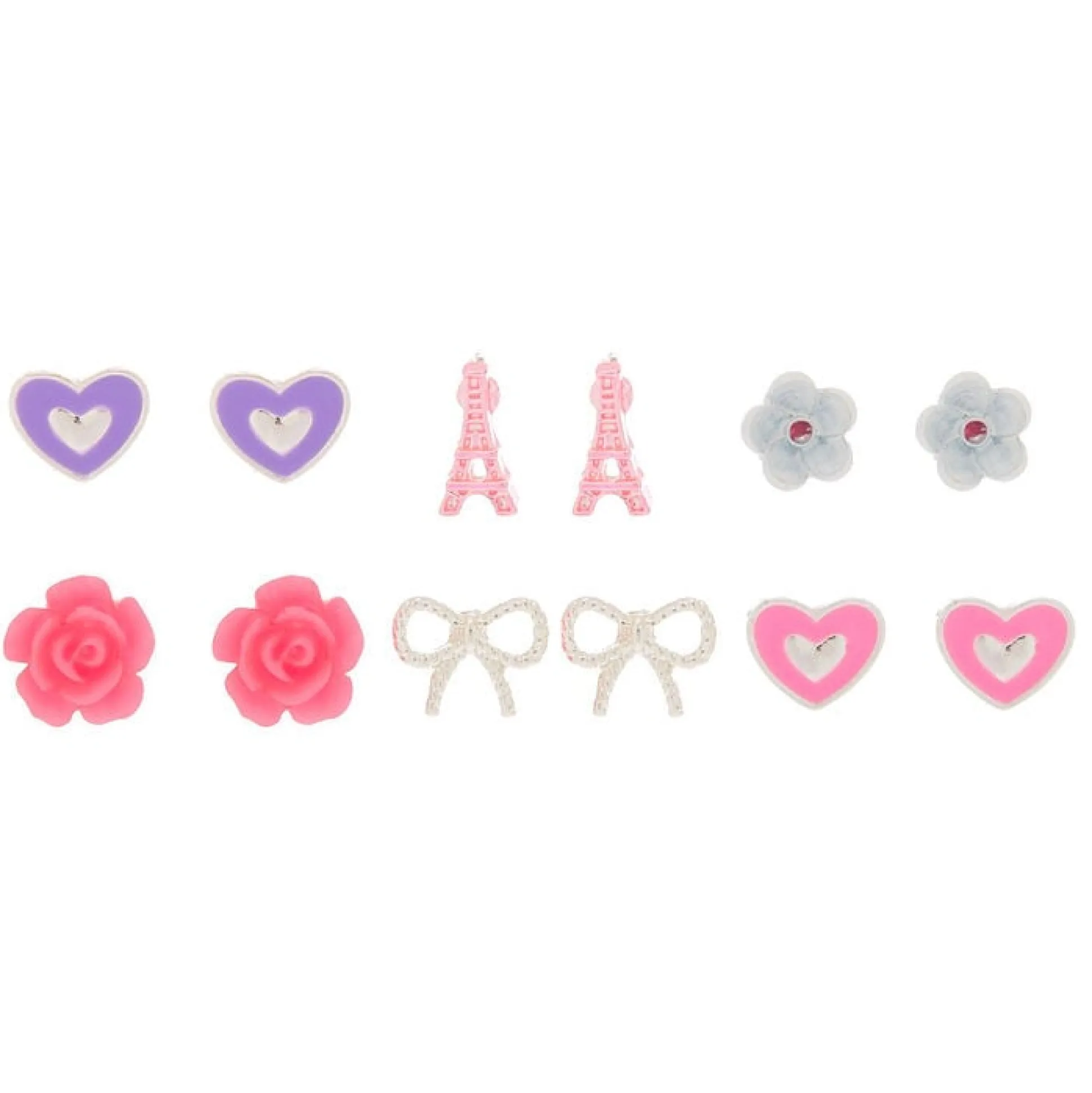 Fall in love with this pretty pink set of Parisian inspired earrings! This set of lovely stud earrings features Eiffel Towers, bows, hearts, and flowers.