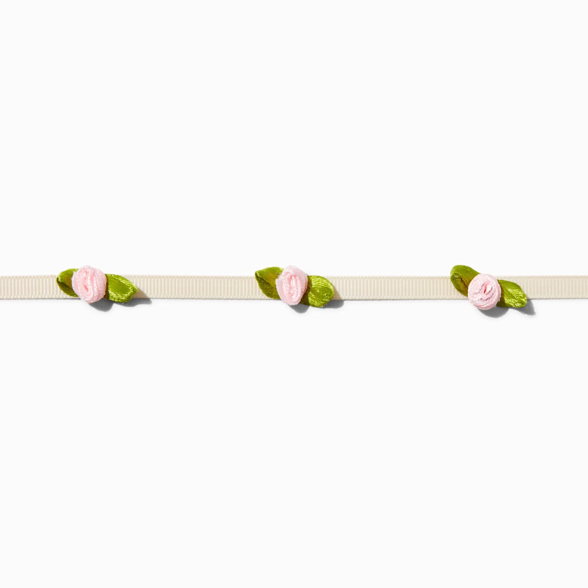 Finish your look with a little romance with this white ribbon choker necklace. It has dainty pink rose adornments.