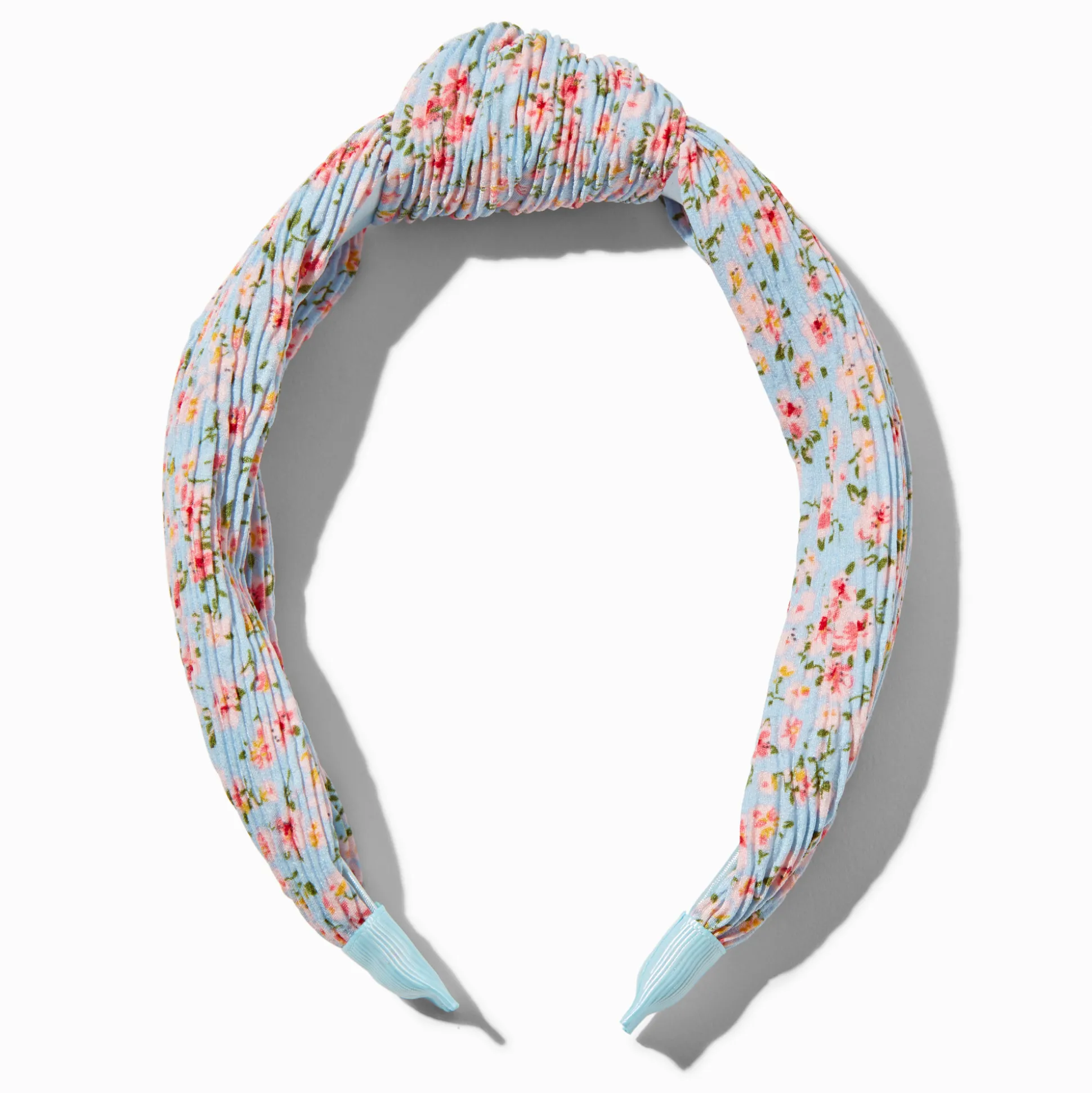 With a fresh-as-spring blue floral pattern, this lovely headband will pull your hair back in sweet style. It features a pretty pleated fabric and a knot on top for extra flair.