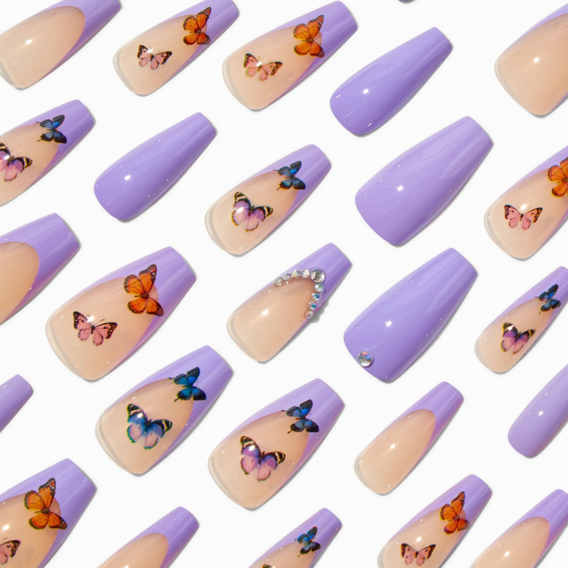 With an improved fit and up to a 7-day wear, these vegan faux nails are on-trend faves. They come in 12 different sizes, so finding the perfect shaped nail is a breeze. With a squareletto shape, these faux nails have a butterfly design.
