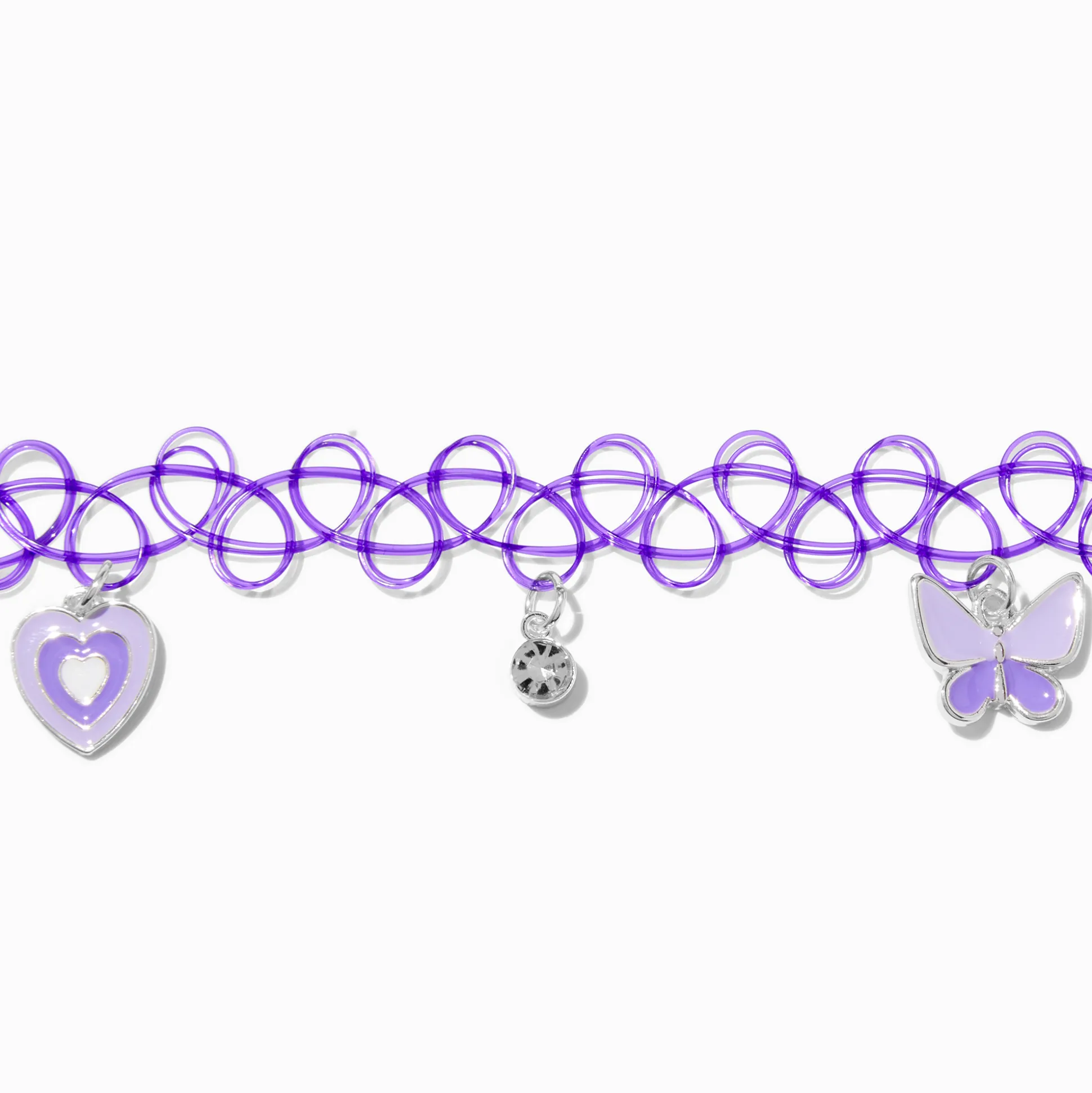 Be the most you in this tattoo-style choker necklace. The purple necklace has a pulsing heart, a faux crystal, and a butterfly charm.