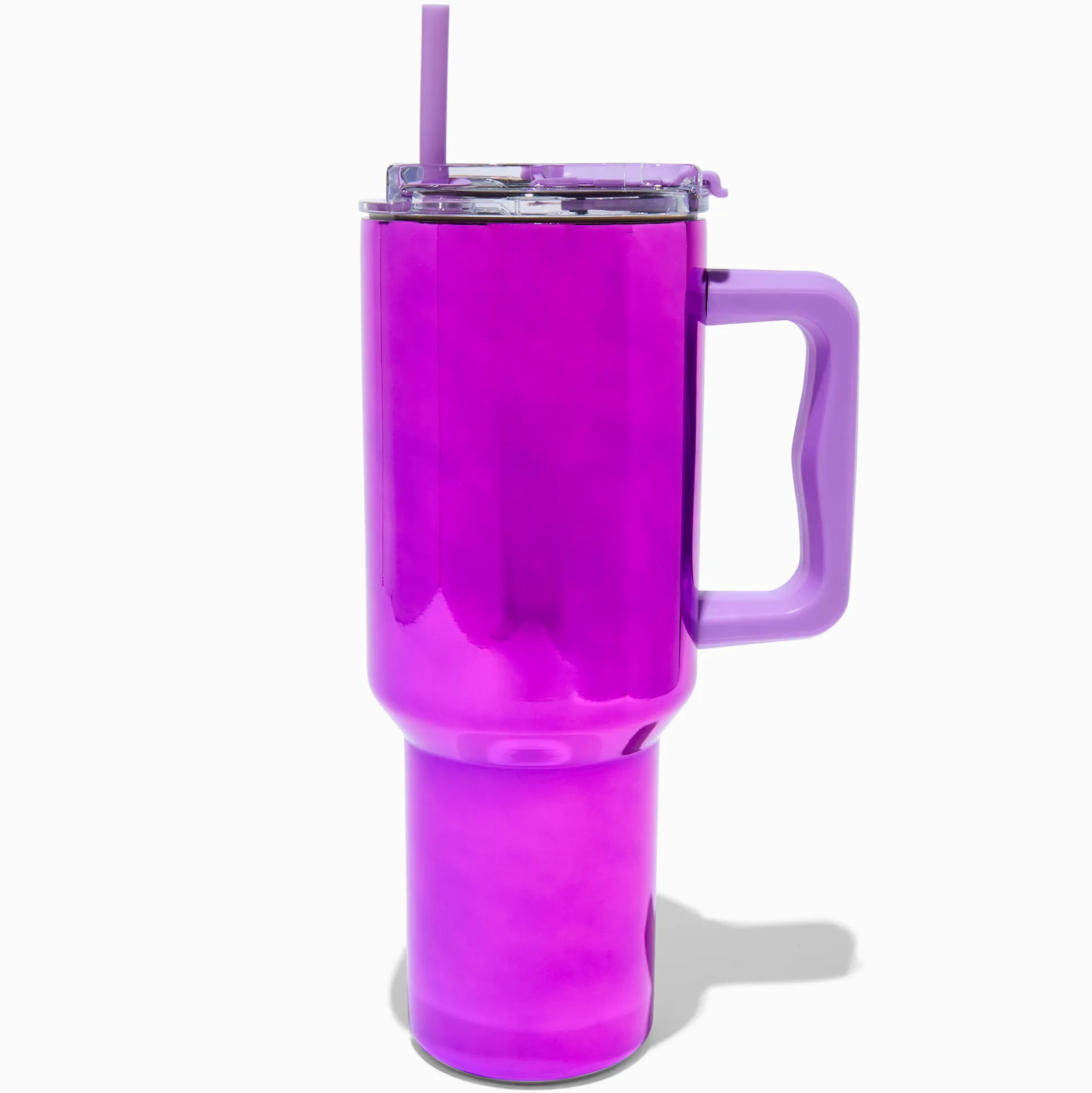 A cool tumbler will inspire you try and stay hydrated throughout the day! This one has a purple chrome finish. There’s also a matching straw, a convenient handle, and a lid with a hole for a straw and a lidded spout. The bottom is tapered so it fits into standard car cup holders.