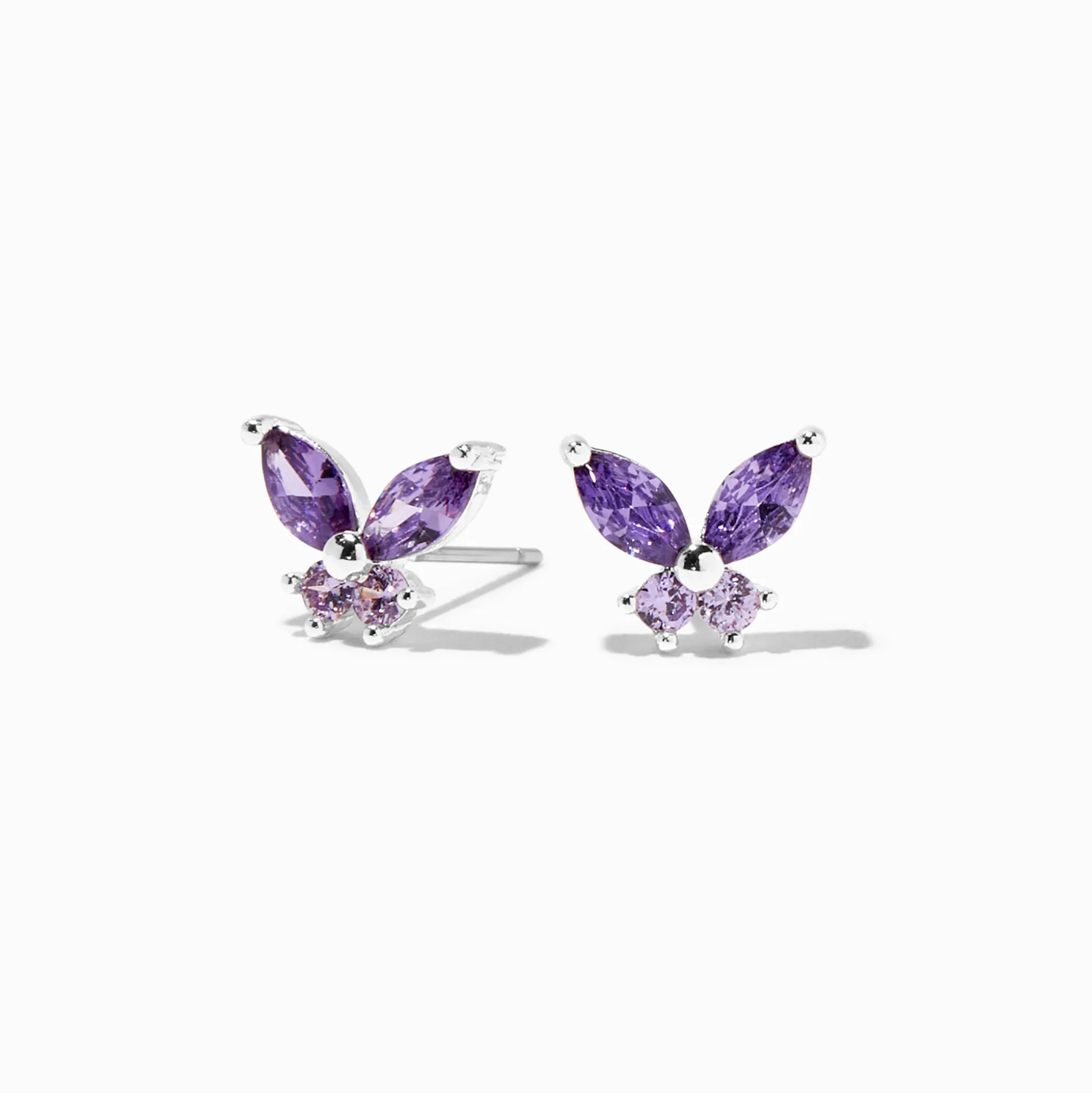 These stud earrings add a pop of purple to your ears! The shiny silver-tone butterflies feature cubic zirconia wings.