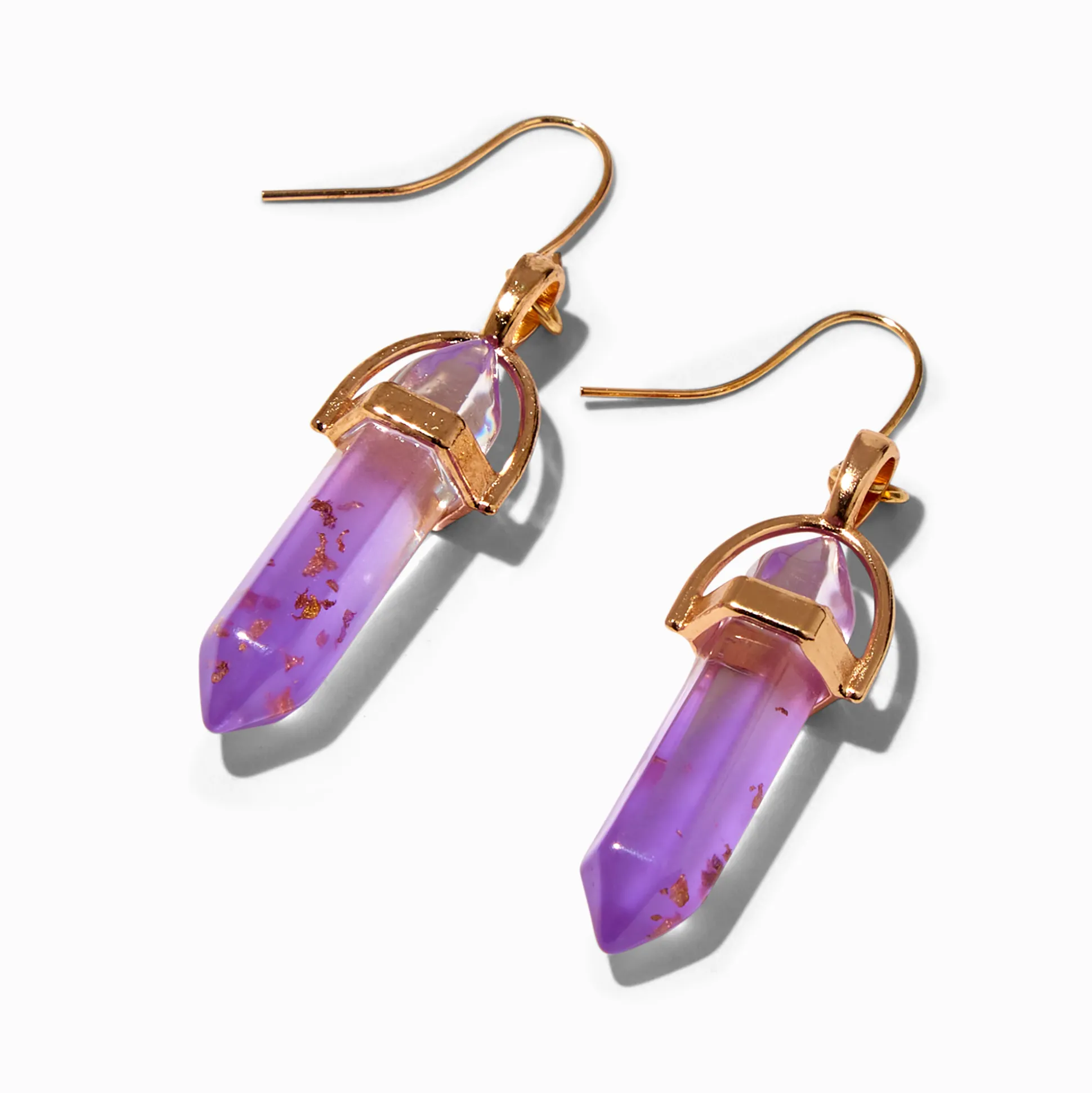 During the day, these faux mystical gems will add a touch of a calm vibe to everything you do. At night, watch the purple drop earrings magically glow in the dark! The earrings hang from gold-tone hardware for pierced ears. For best results, expose the glow-in-the-dark charms to light.