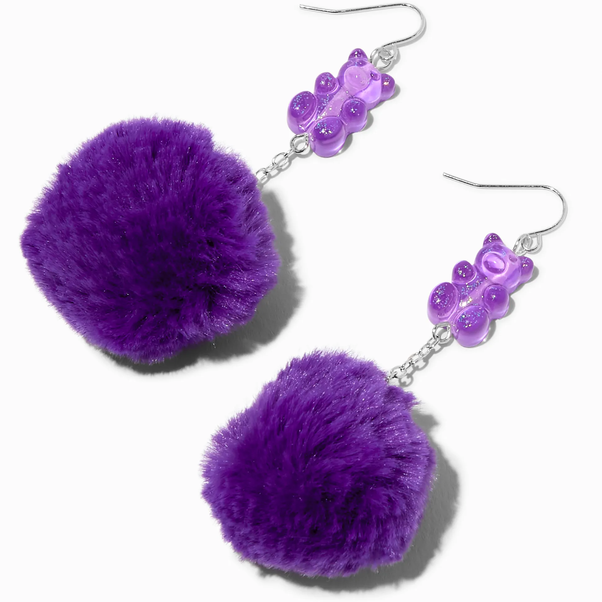 Give your look a pop of purple with these drop earrings. They feature a purple-colored pom pom ball & gummy bear charm dangling from each earring.