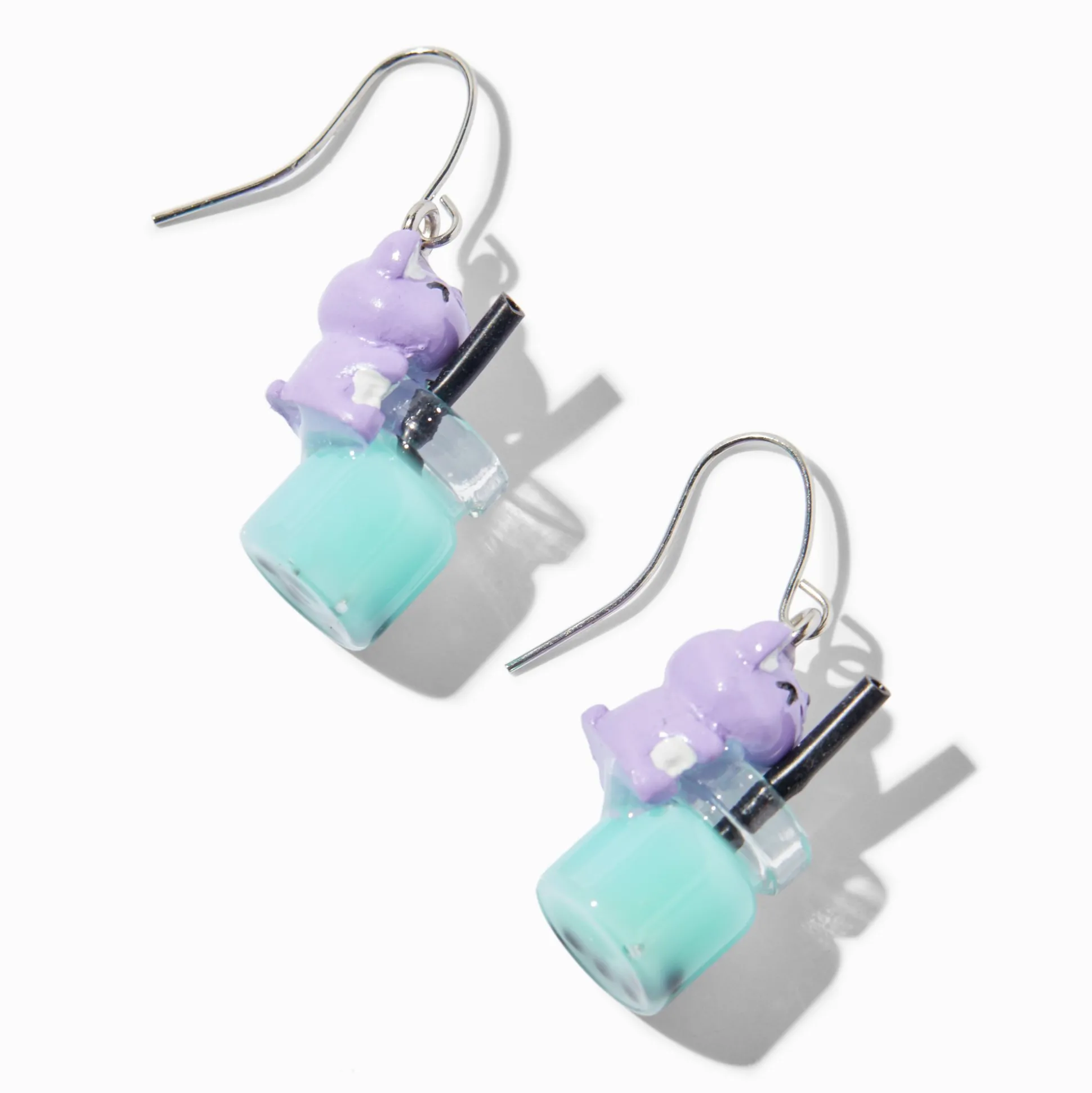 These drop earrings are a super sweet detail for your fave ‘fit. The silver-tone fish hook closures each have a purple hamster friend and a teal boba tea cup with a black straw.
