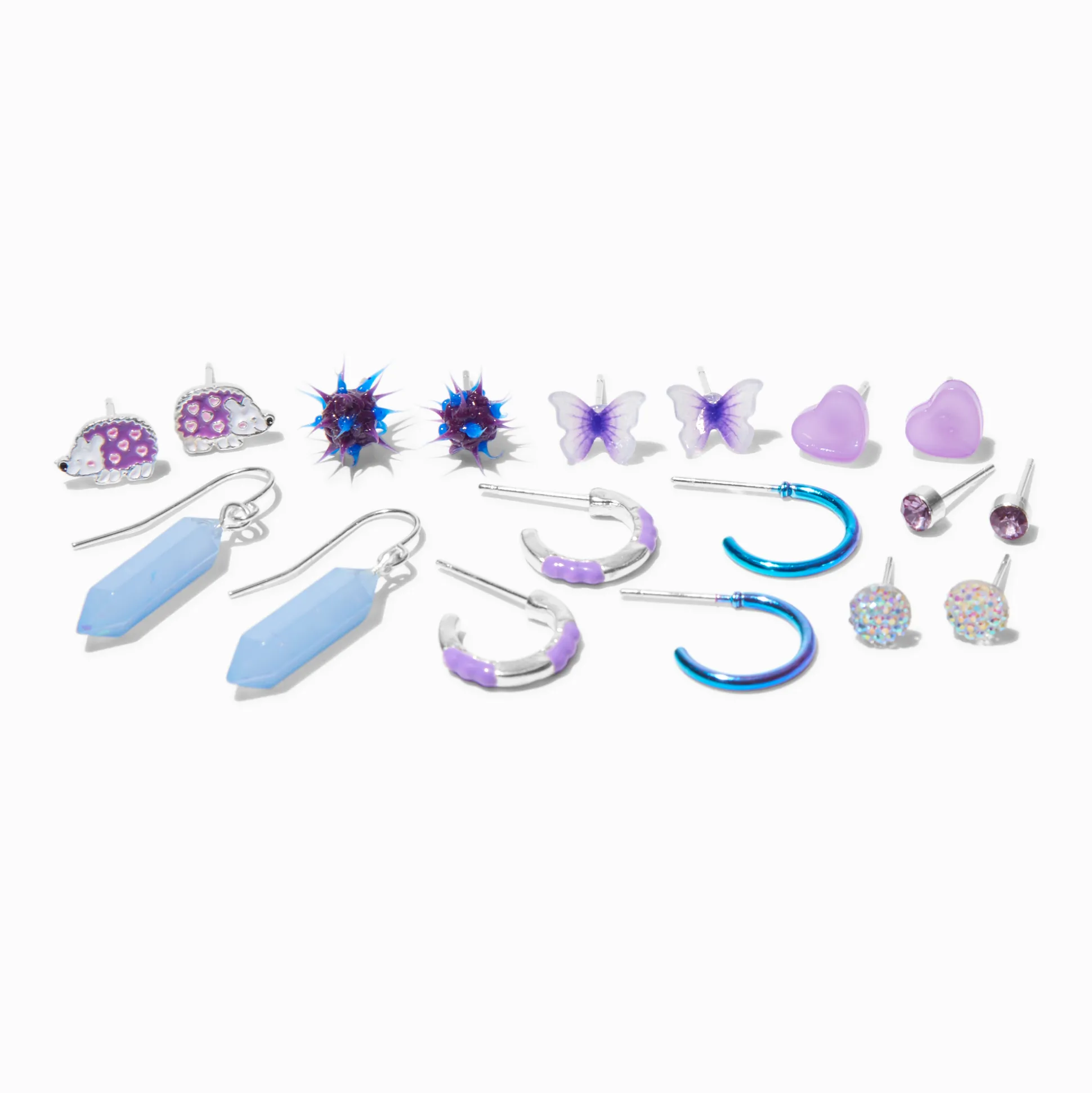 Always have the perfect pair of earrings with this expansive set. The 9 pack includes purple icons, like: hedgehogs, hearts, faux crystals, and more.