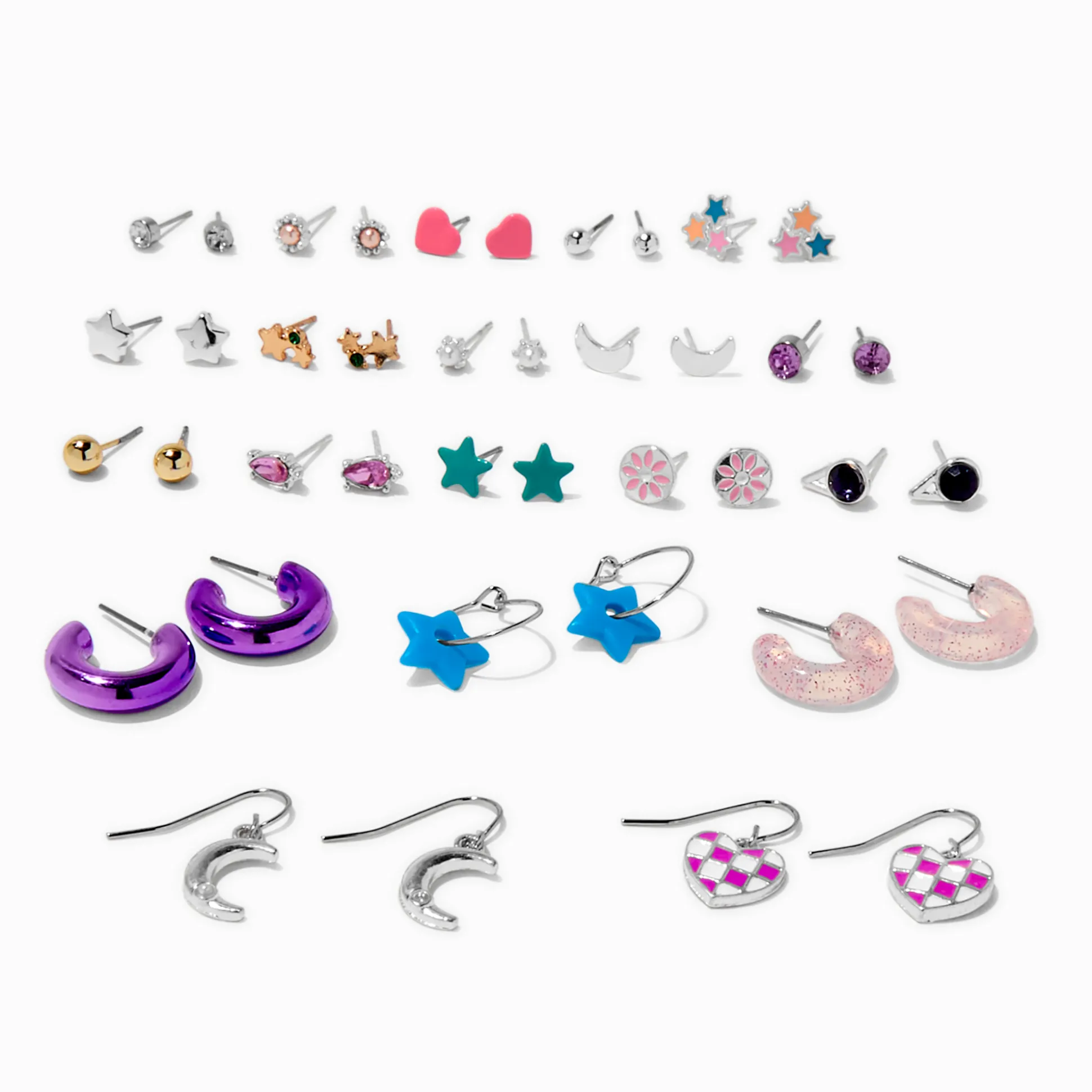 Stack these coordinating earrings and create your own earscape. Perfect for showing off your double or more piercings. The 20-pair set includes 15 studs, 3 hoops, and 2 drops.