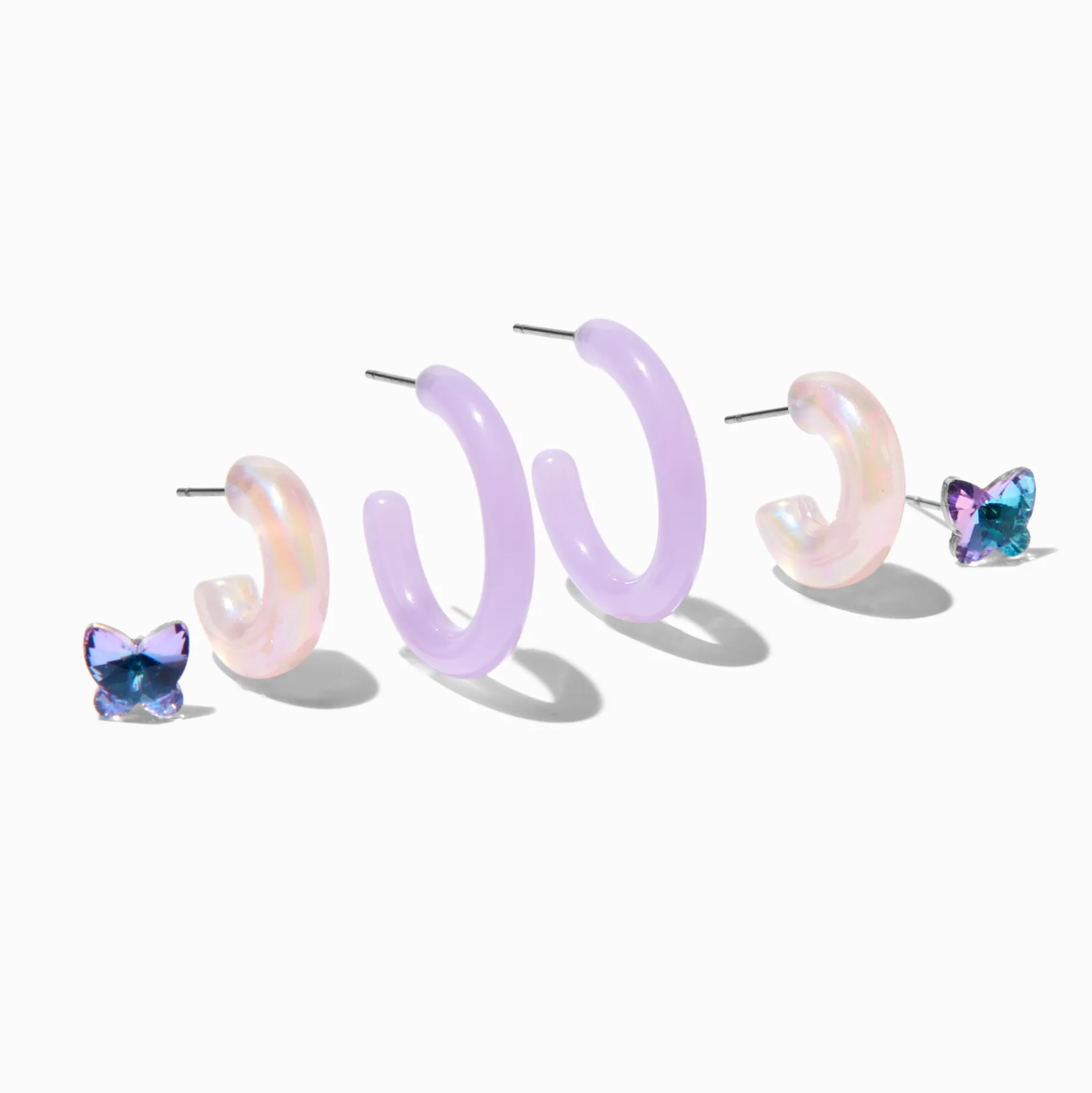 Show off your multiple piercings! Stack this three-pack of earrings however you wish to create your own unique look. The set includes three pairs, including two pair of hoops and petite butterfly studs.