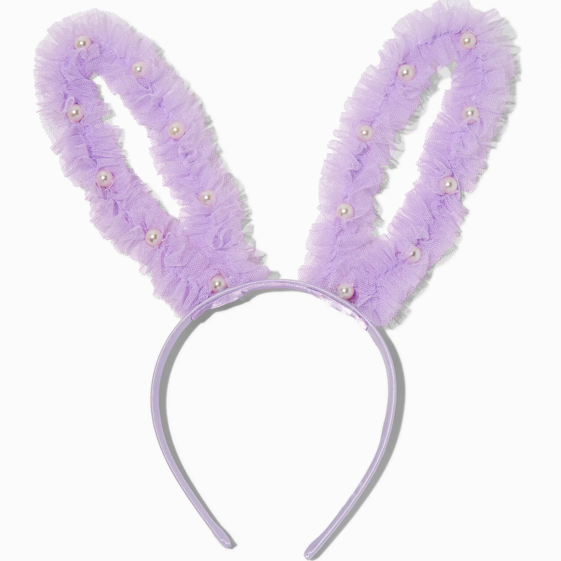 You’ll look so cute hopping around in this bunny headband! The thin headband has purple tulle ears that are studded with faux pearls.