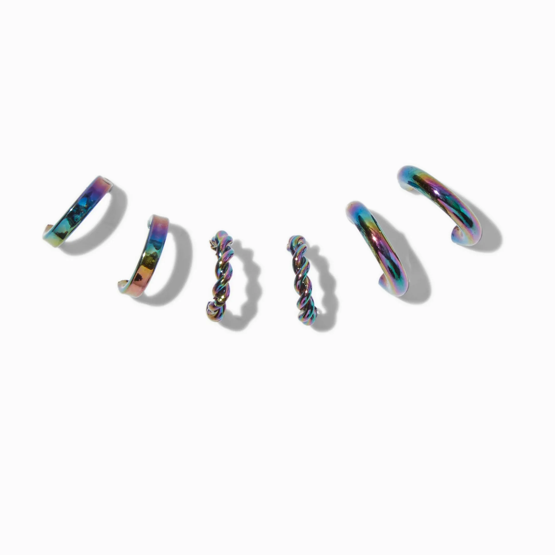 Stack these coordinating hoops and create your own earscape. Perfect for showing off your double or more piercings. The set has plain, twisted, and textured hoops in flashy rainbow anodized.