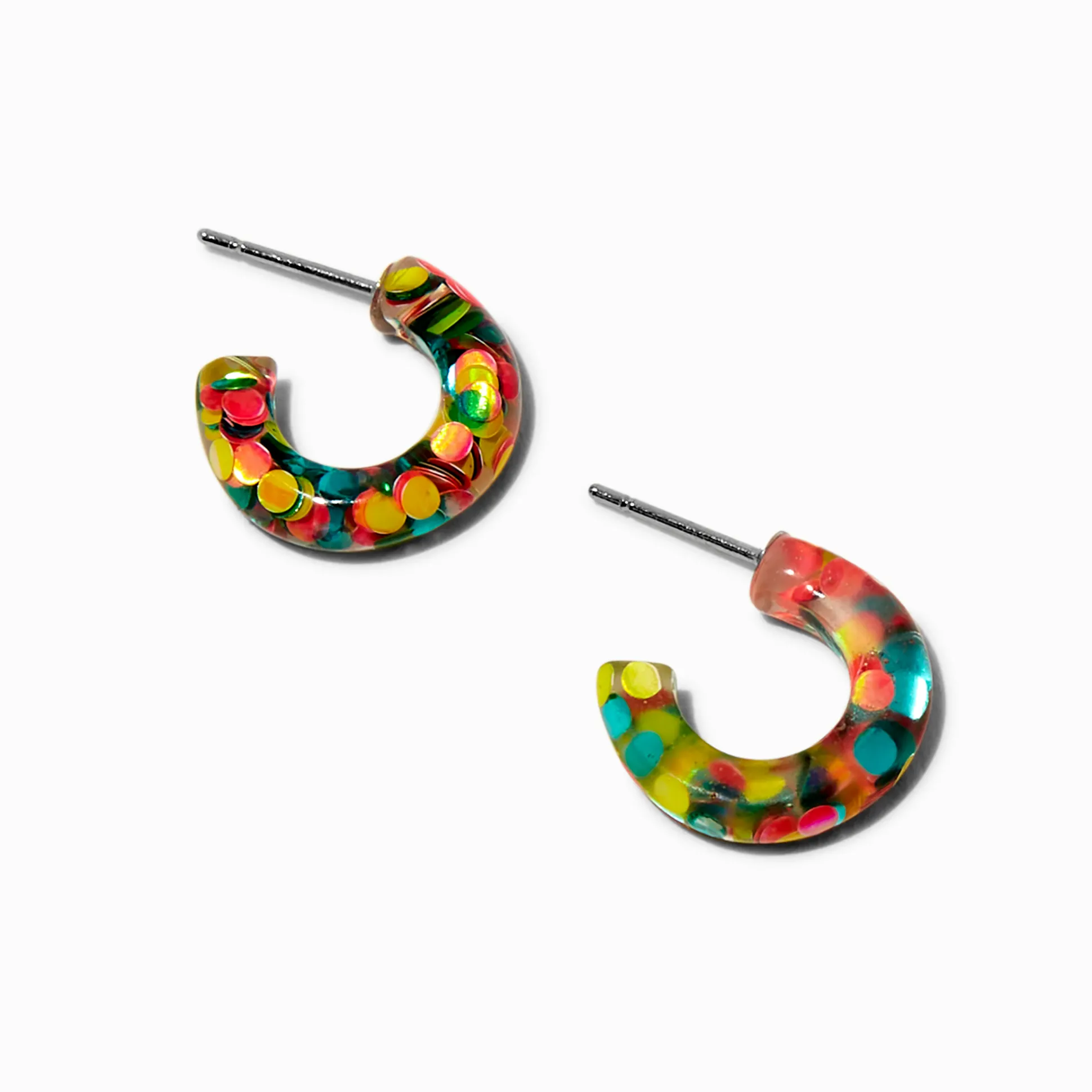 It’s always a party when you bring the confetti. These clear hoop earrings are filled multi-hued confetti.