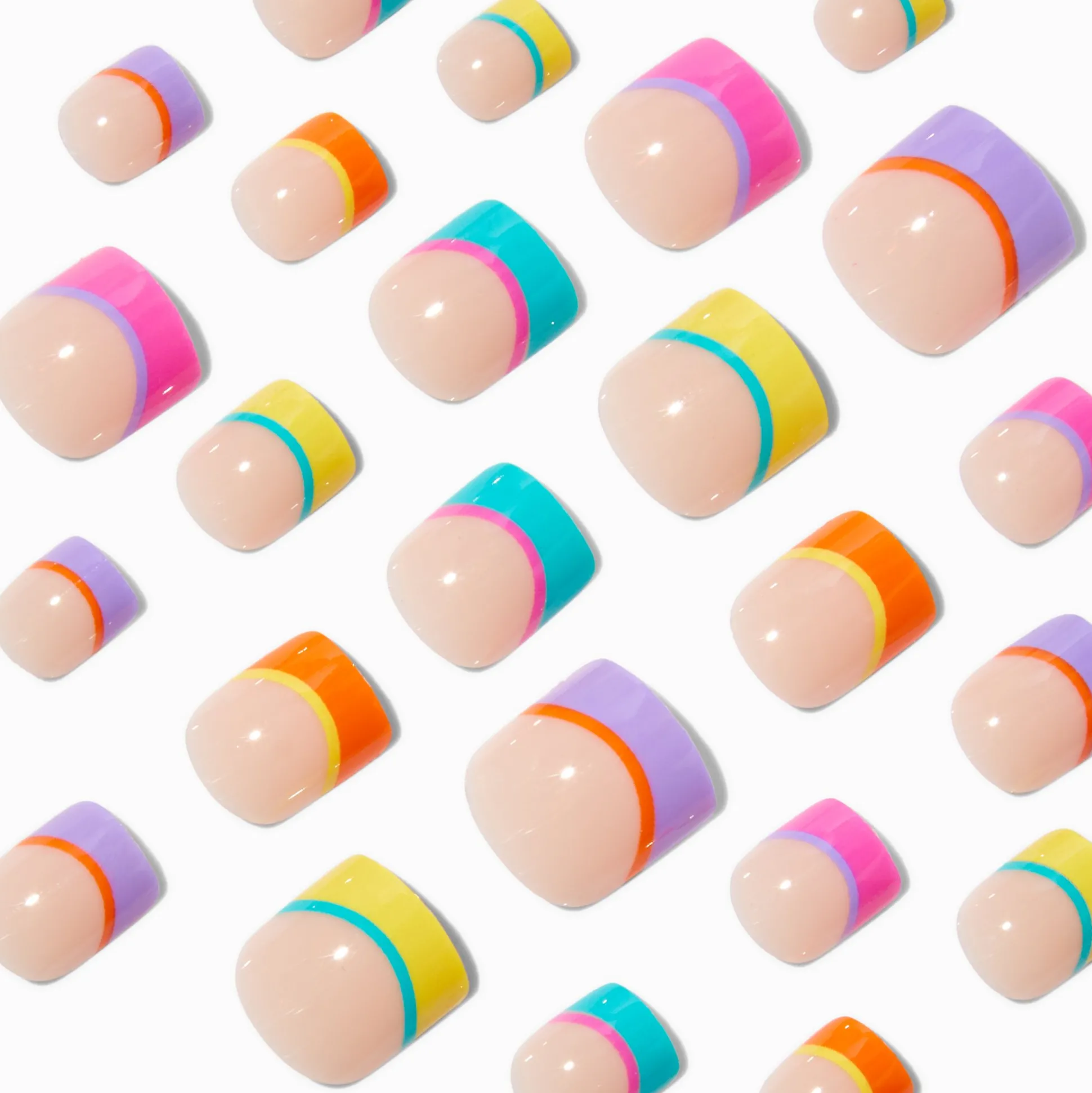 Serious French tip vibes will be right at your fingertips with this on-trend set of faux nails. Square-shaped nail set features a collection of rainbow-colored French tip designs. Vegan nails are easy to apply, just press on and go!