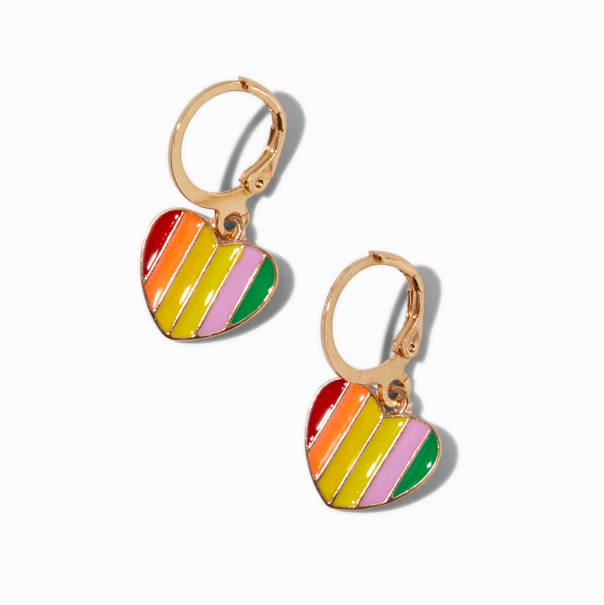Decorate your ears with rainbow flair with these huggy hoop earrings. The gold-tone designs have a heart-shaped charm that’s covered in rainbow colors.
