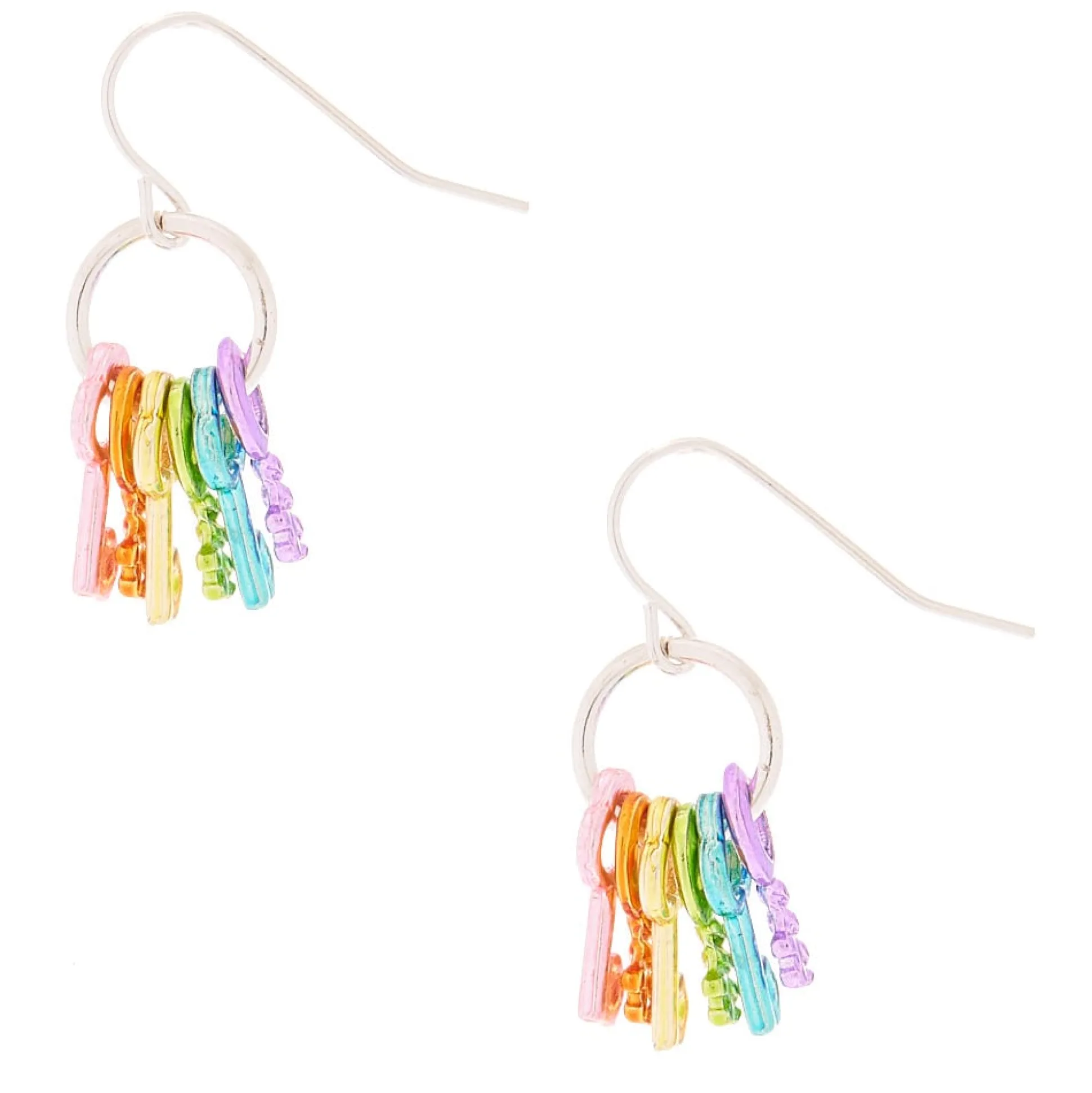 Open your heart to color and rock these key earrings! Colorful keys dangle from a silver-tone ring.