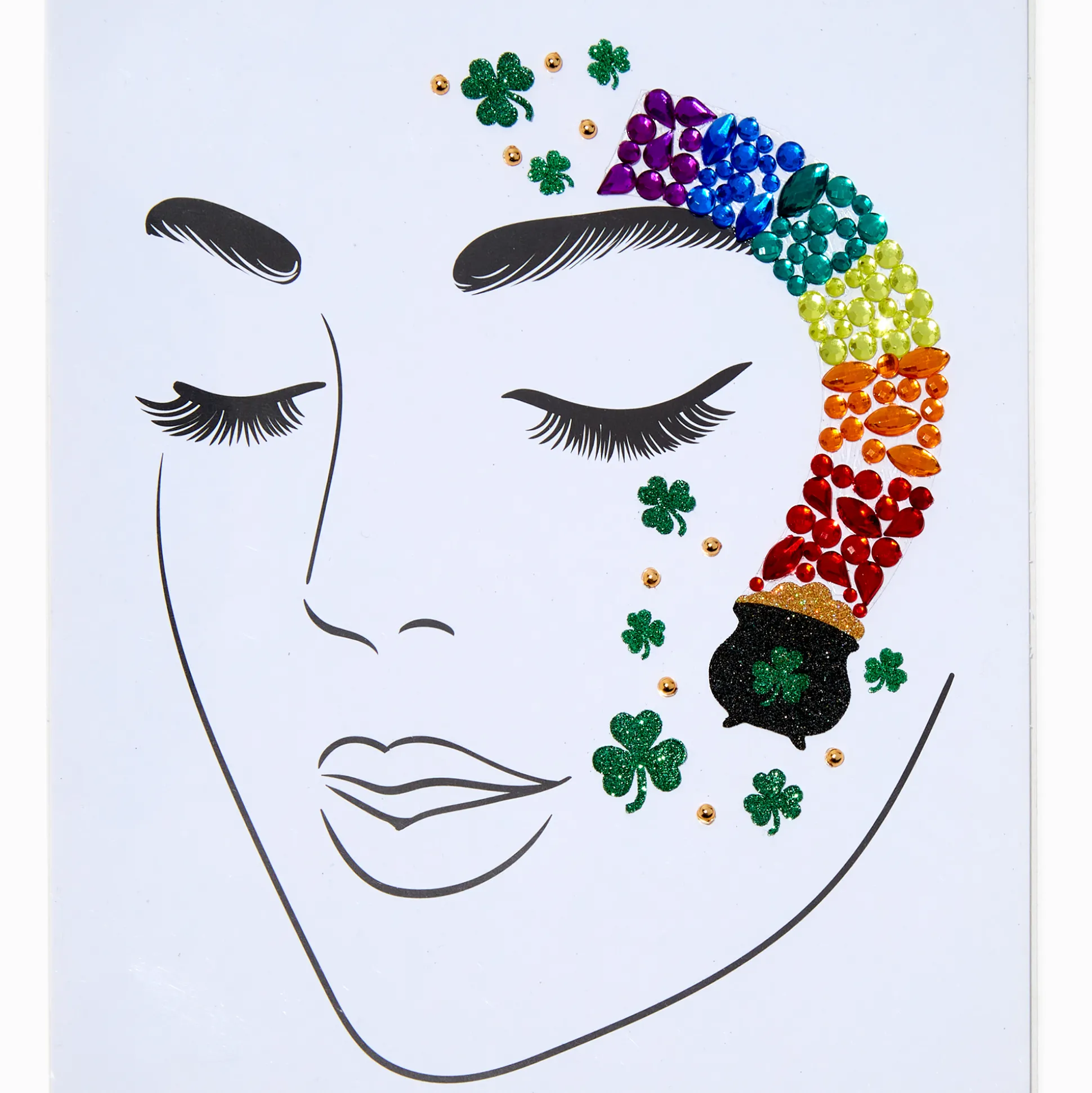 Decorate your face for St. Patrick’s Day with these glittery stickers! The design has a sparkly, colorful rainbow and a pot of gold. Easy to apply and remove!
