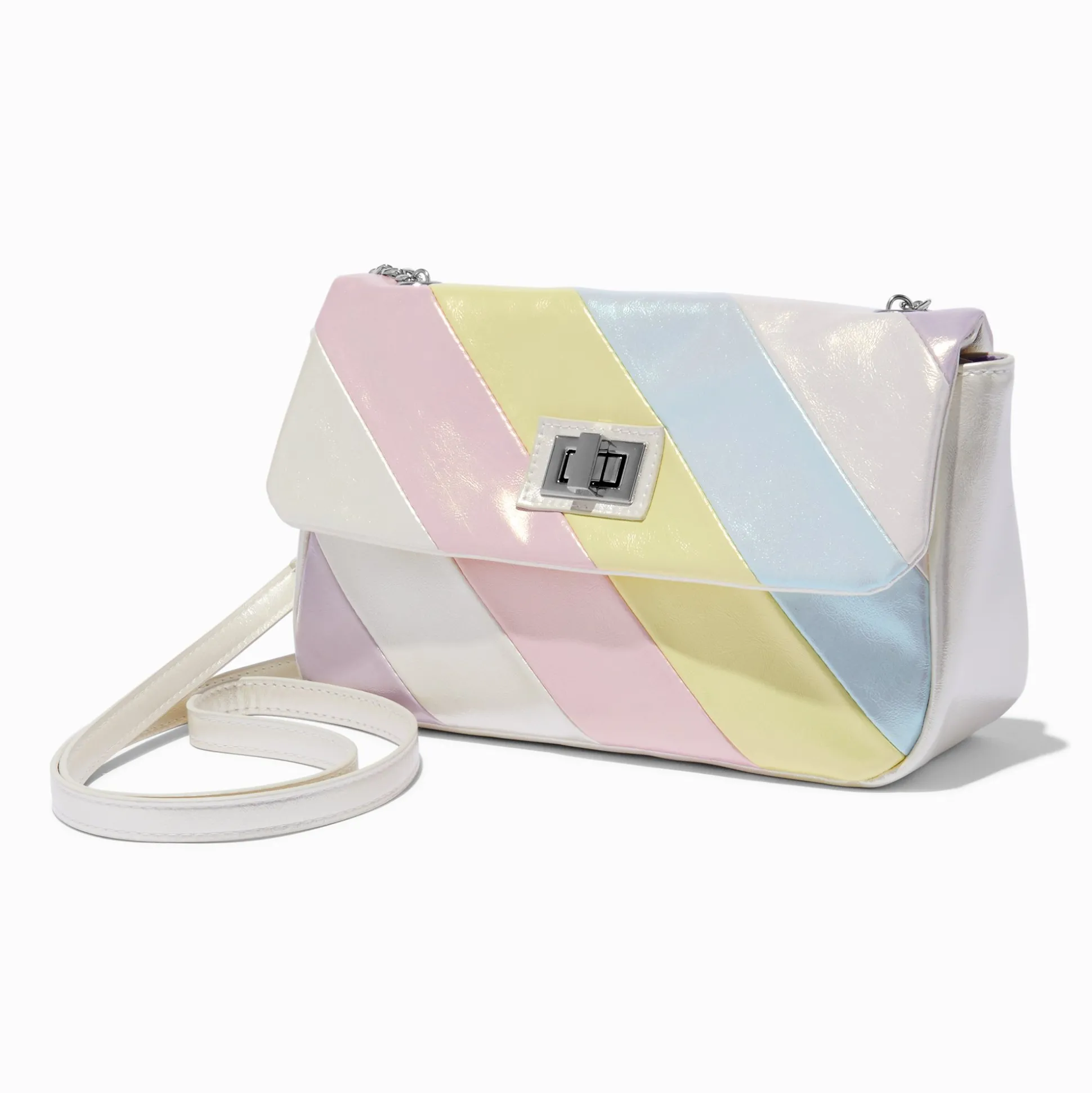 Fashion meets function with this faux-leather bag. This rainbow-striped bag has a slight sheen for subtle glitz and glamour. There’s room inside for the small essentials you’ll need for a day of shopping or a night out.