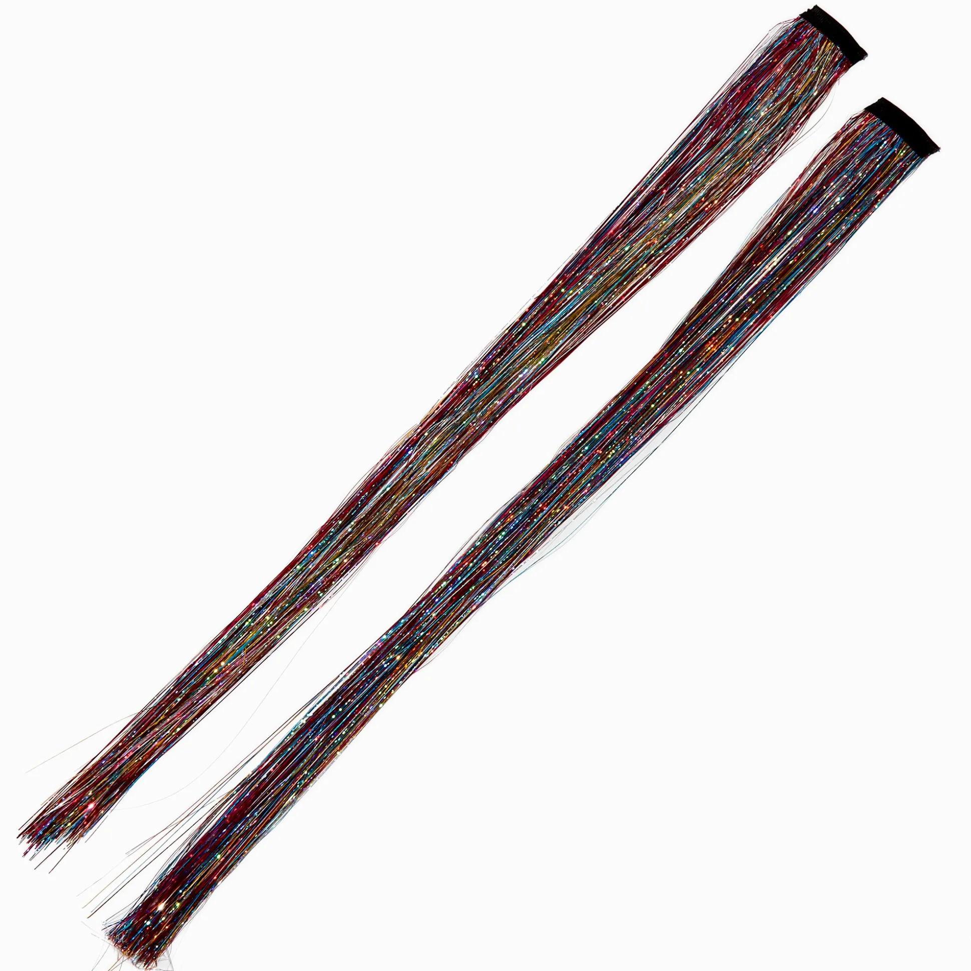 Jump on the tinsel bandwagon! You can change up your look in an instant with these fun tinsel faux hair clips in a rainbow of sparkly jewel tone colors. Set of two with snap clips attached for easy placement in your hair, ponytail, braid, and more.