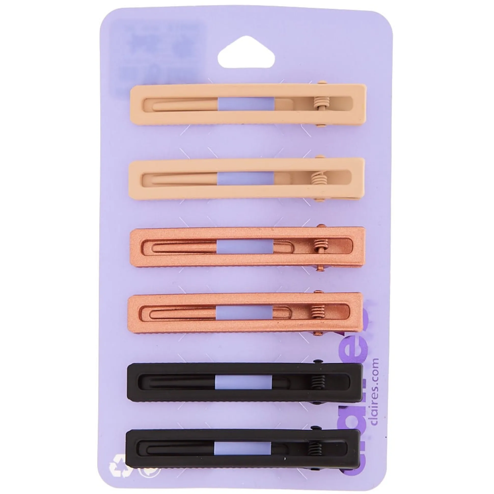 Clip your hair back in style with the perfect everyday hair clips! This pack of rectangular shaped hair clips feature solid neutral colours, including matte black, matte nude, and rose gold.