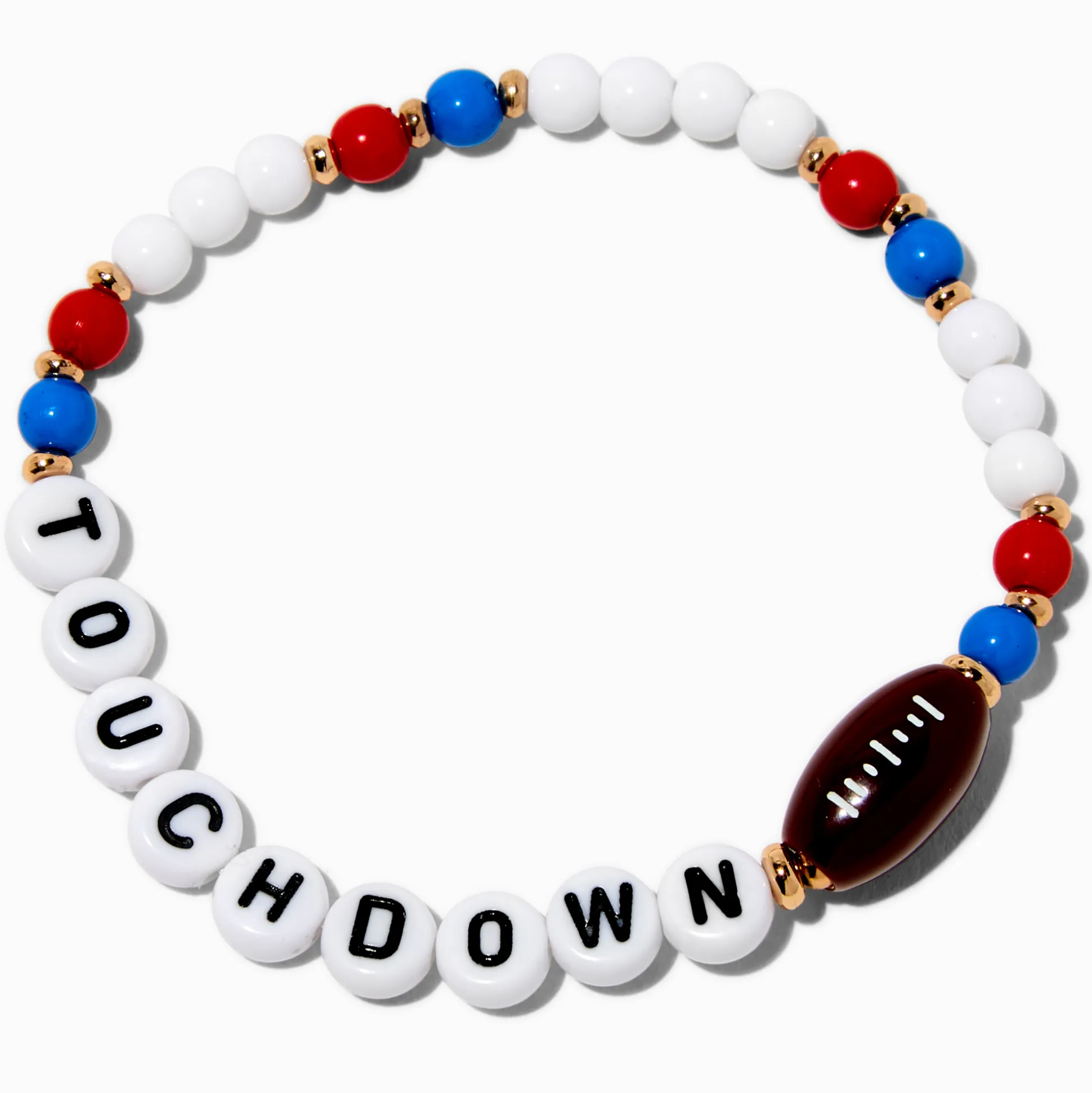 Score your own touchdown when you add this stretch bracelet to your bracelet stack. The white beaded bracelet has red and blue beads, “Touchdown” in alphabet beads, and an enamel football charm.
