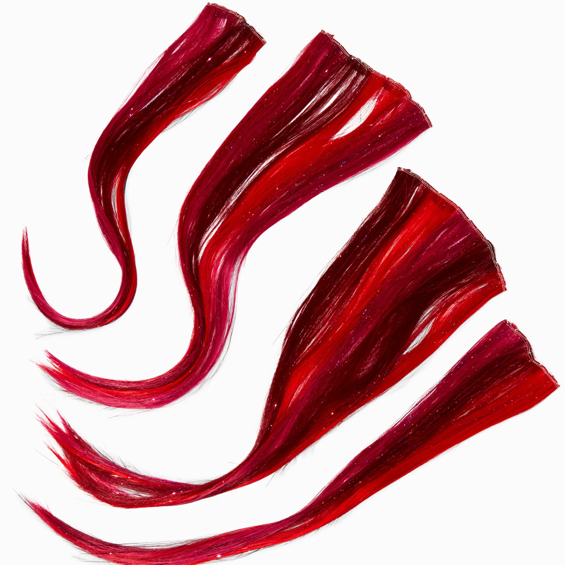Love the look of long, colorful hair but not ready to make the commitment? Then clip in these fun faux hair extensions and change up your look in an instant whenever you want. The set includes four bright red extensions with pops of metallic tinsel for a touch of sparkle.