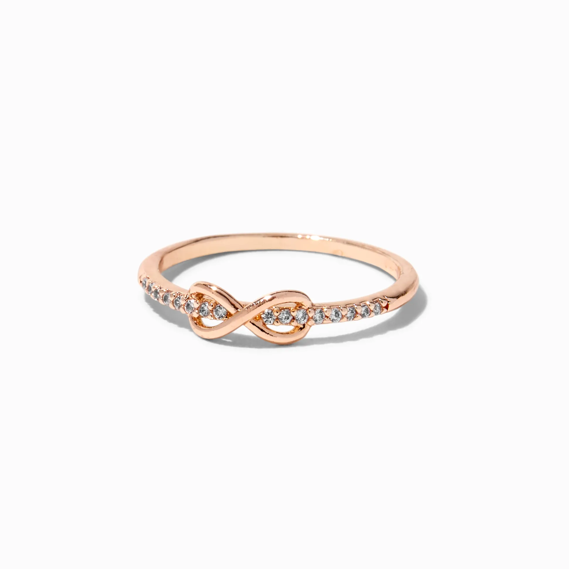 You’ll love this ring forever! This rose gold-tone ring has a row of faux crystals that’s decorated with an infinity symbol. Wear with your other rose gold-tone faves.