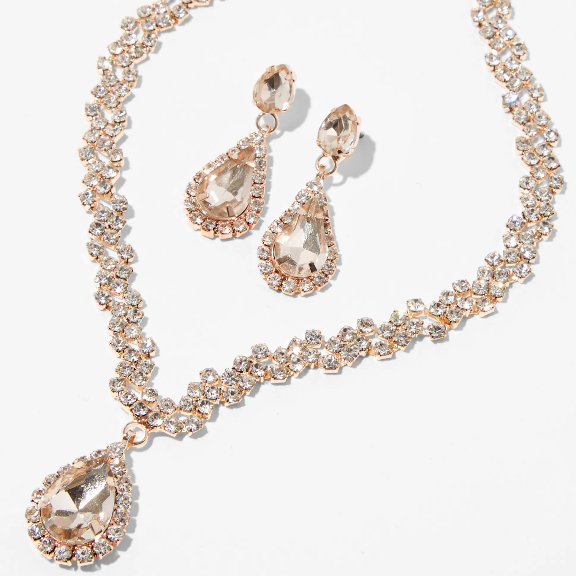 This jewelry set comes with a beautiful shimmery V-neck necklace and matching 1″ drop earrings that both have a rose gold-tone finish and clear glass rhinesones. Wear this set to your next special occasion for a glammed up look.
