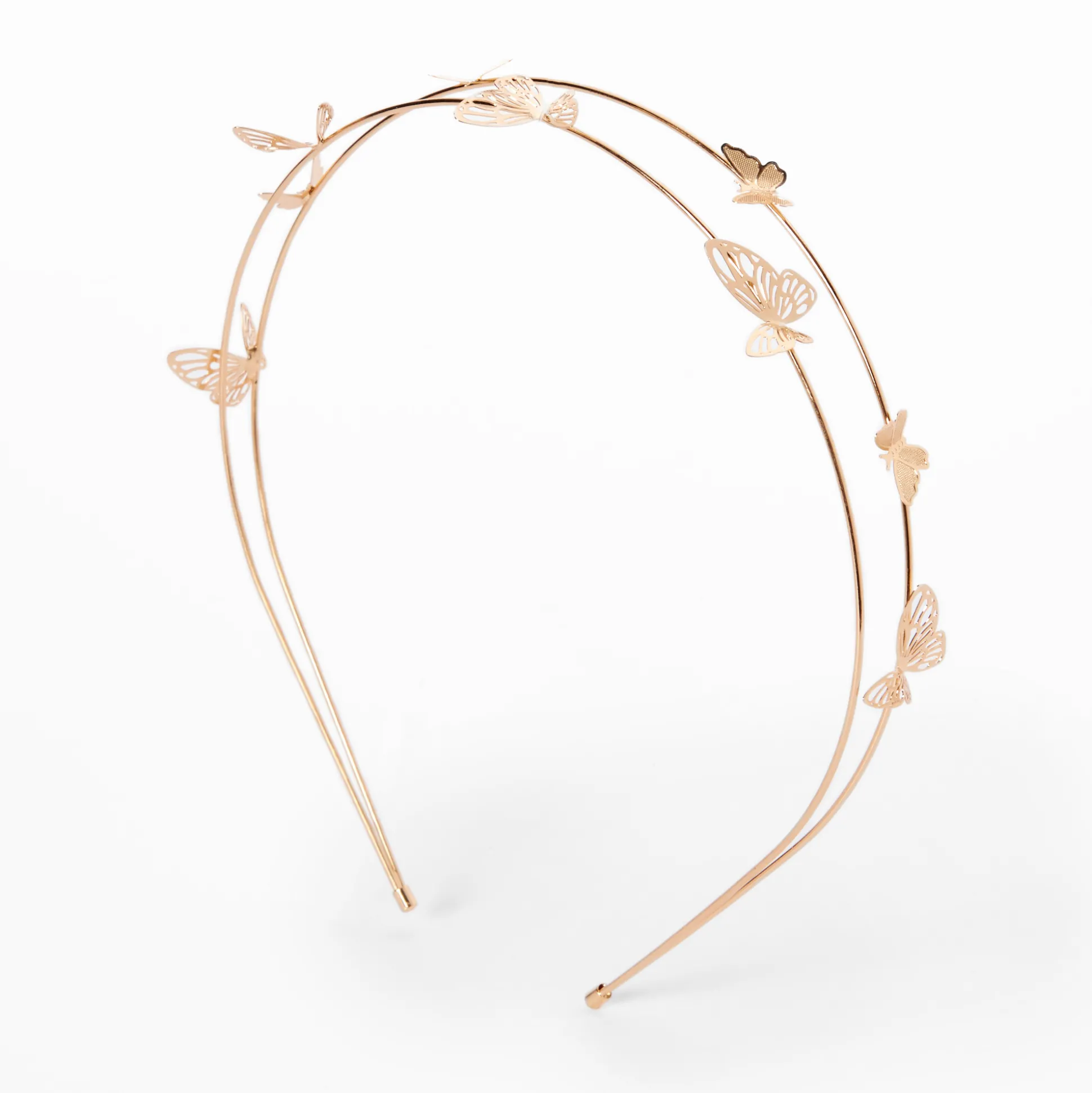 Bring pretty flutter to hairstyles with this headband. Two skinny gold bands are accented with butterflies.