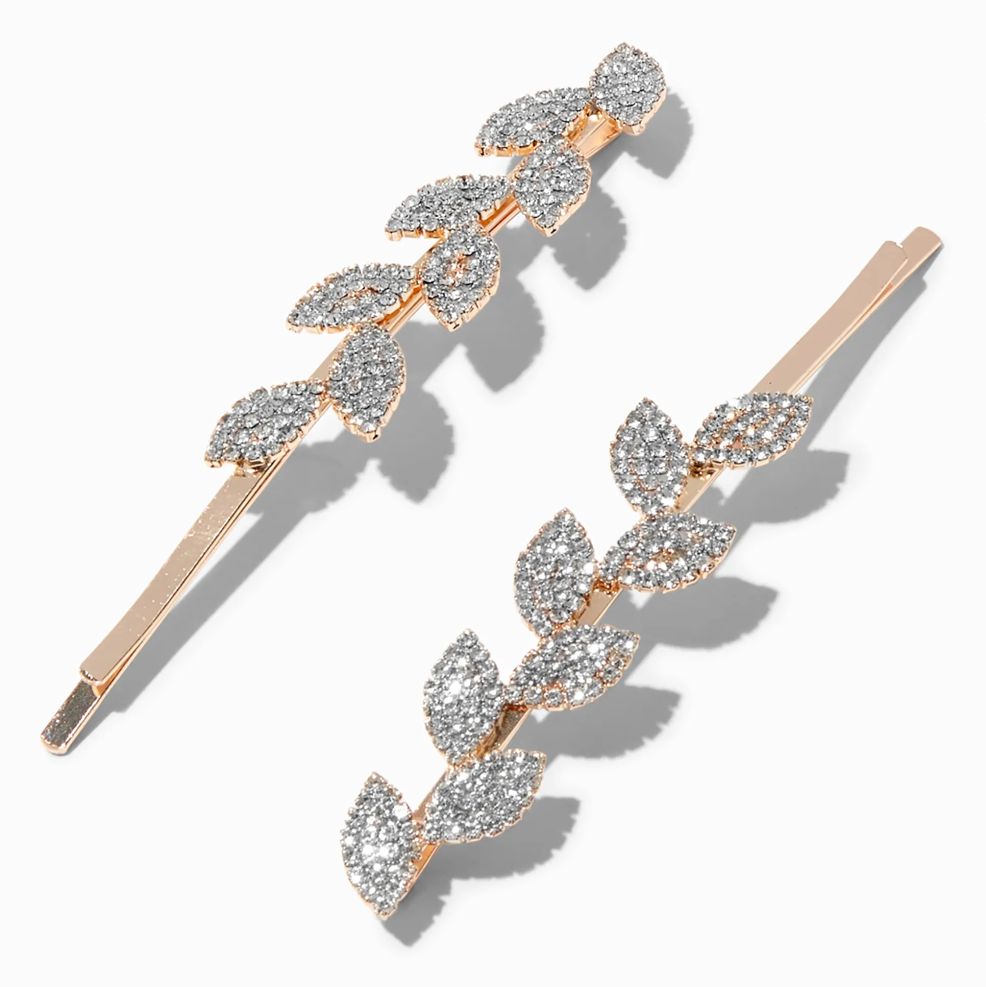 Bring some bling to your updo with this pair of fun faux crystal hair pins that are covered in leaf designs. Wear one or both to double up on the sparkle.
