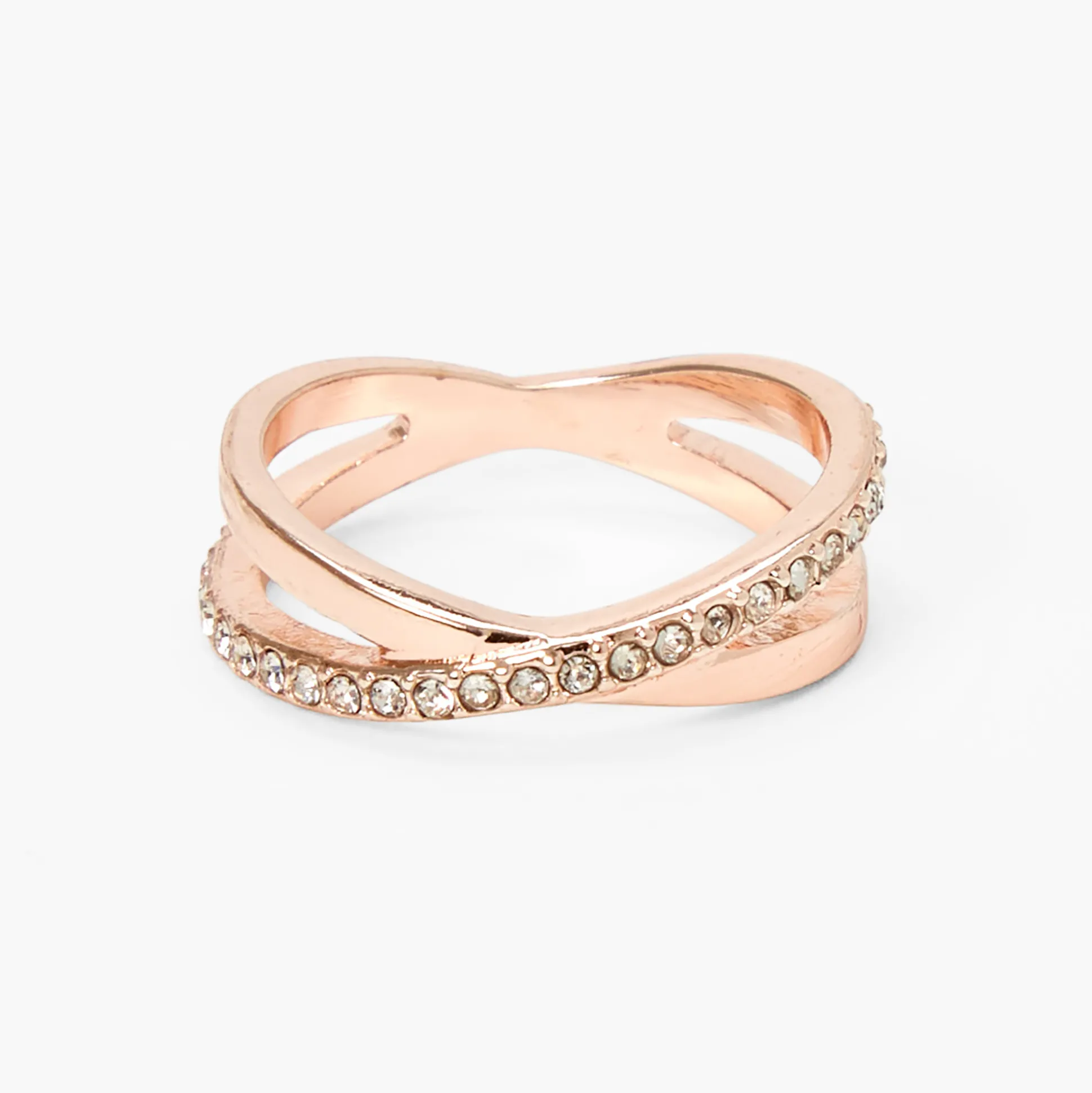 Add elegance to your look for a simple or formal night out with this criss cross ring! This rose gold-tone ring features a super chic criss cross design embellished with small faux crystals for a touch of sparkle.